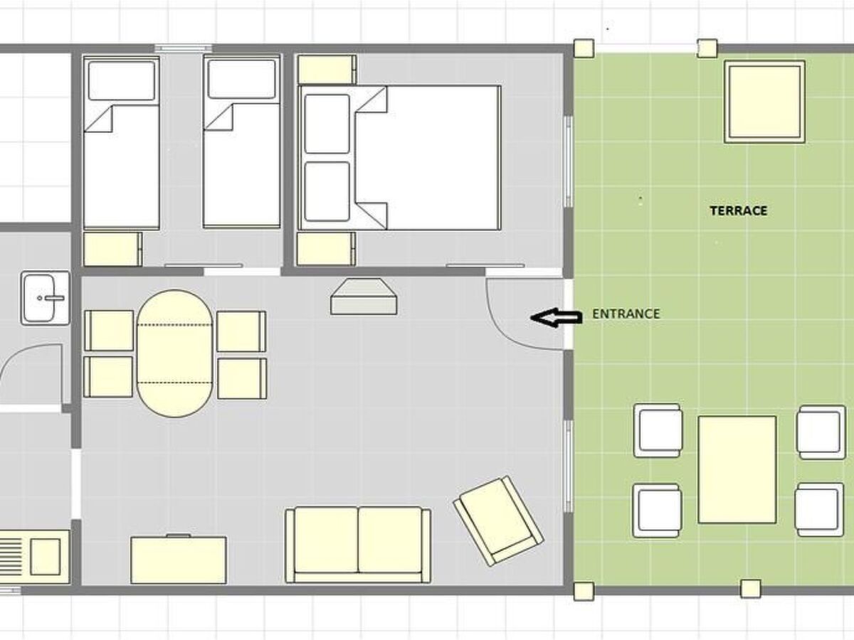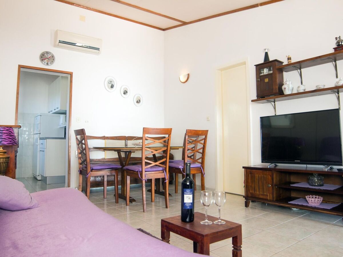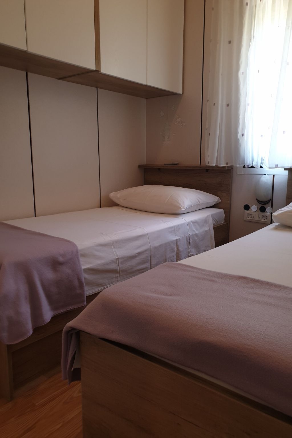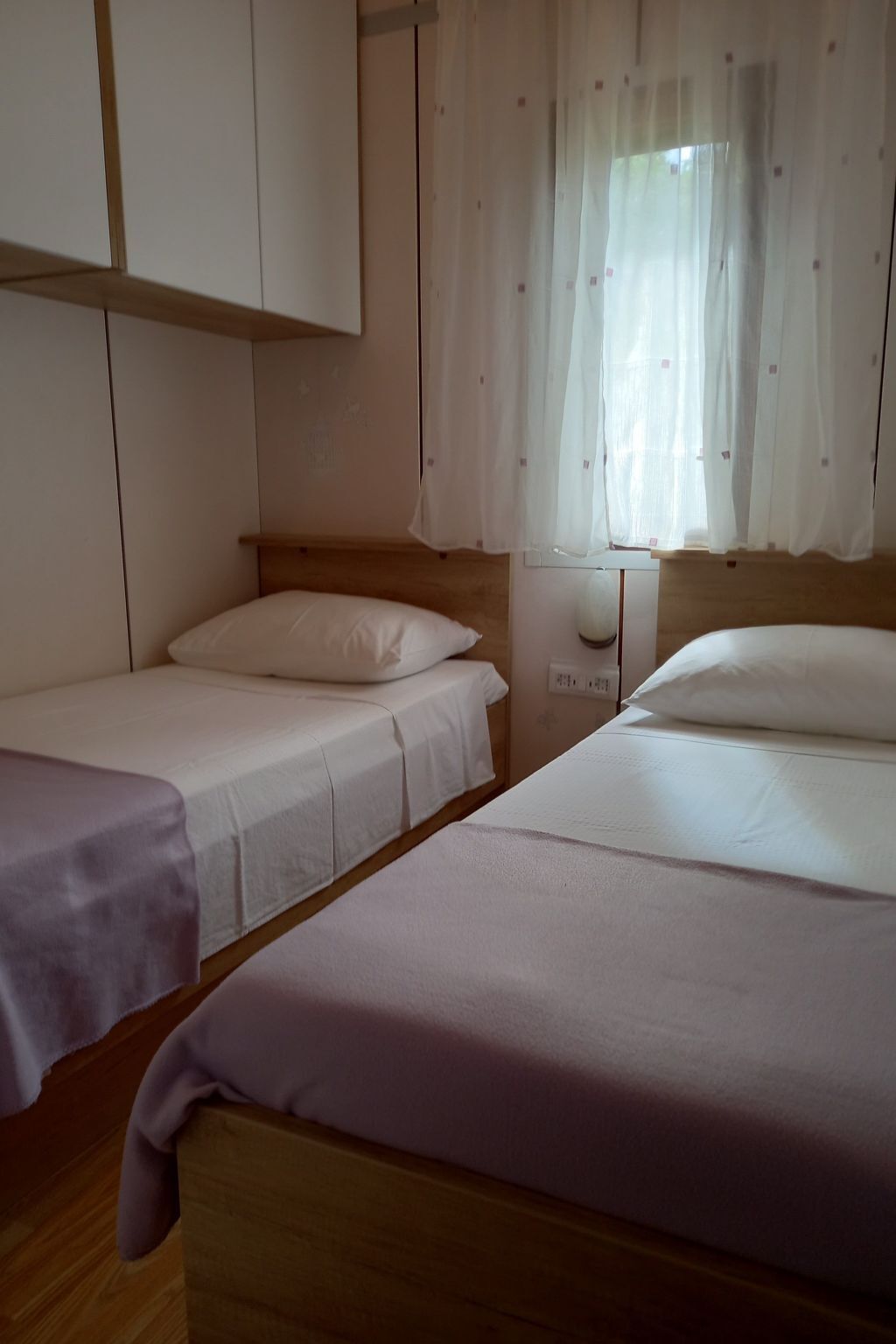 The two bedrooms have a double and two single beds and there is a sofa bed in the living room, as well as a TV, fan and a dining table with a bench and chairs.