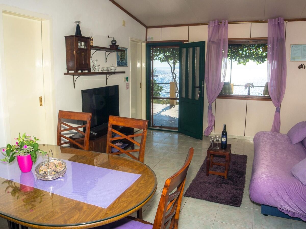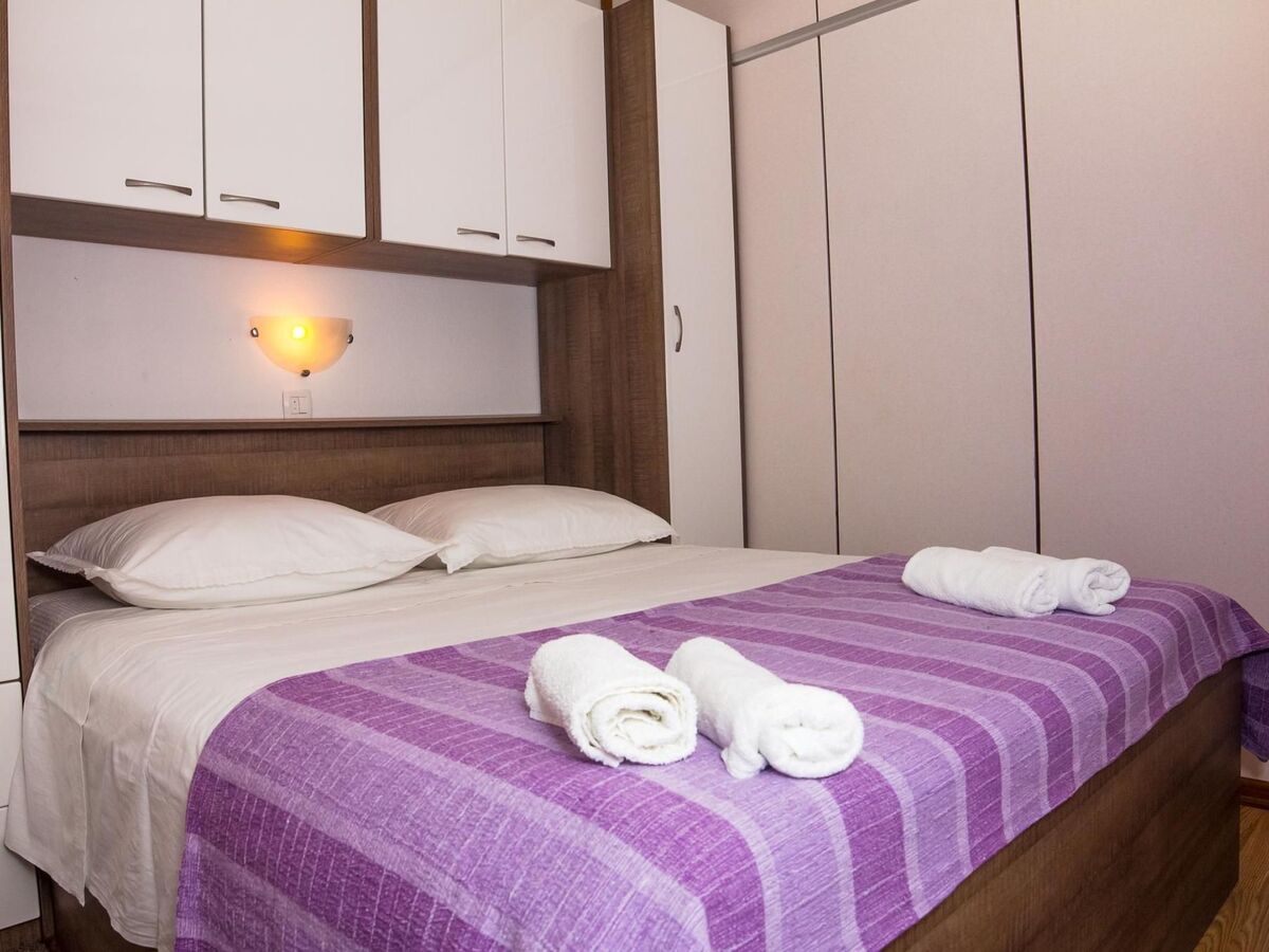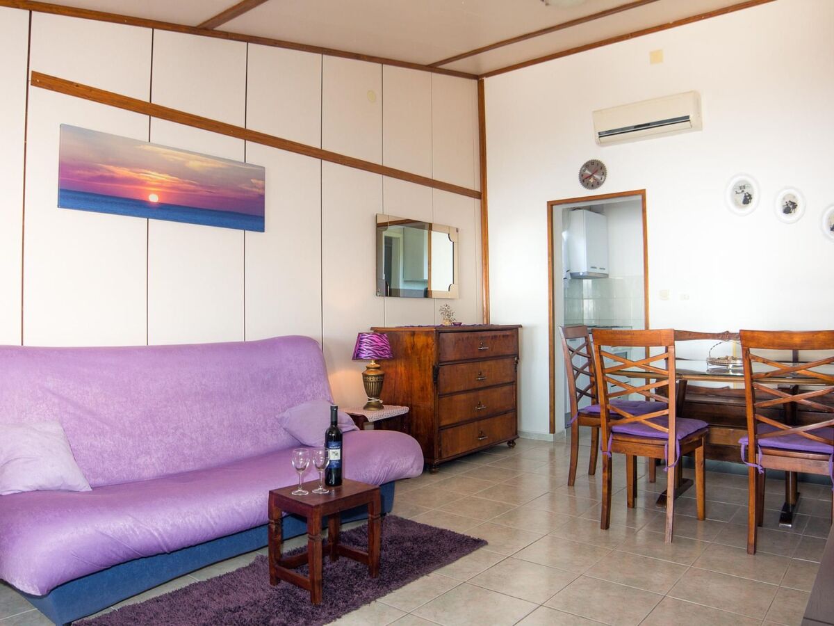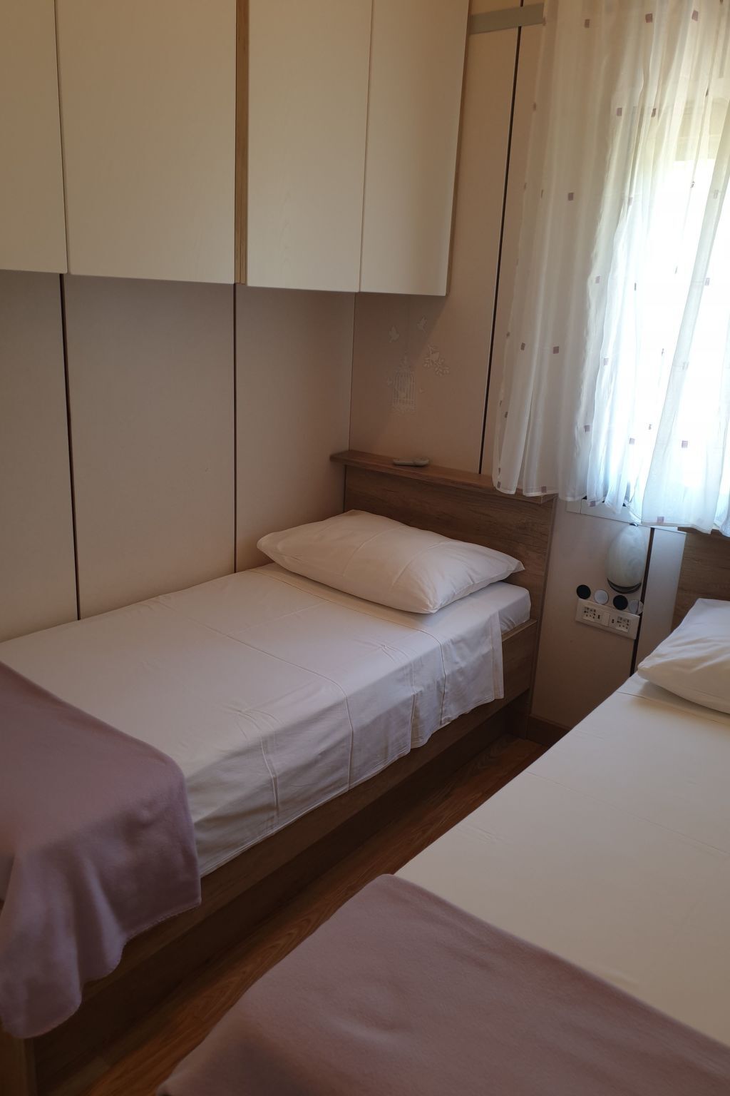The two bedrooms have a double and two single beds and there is a sofa bed in the living room, as well as a TV, fan and a dining table with a bench and chairs.