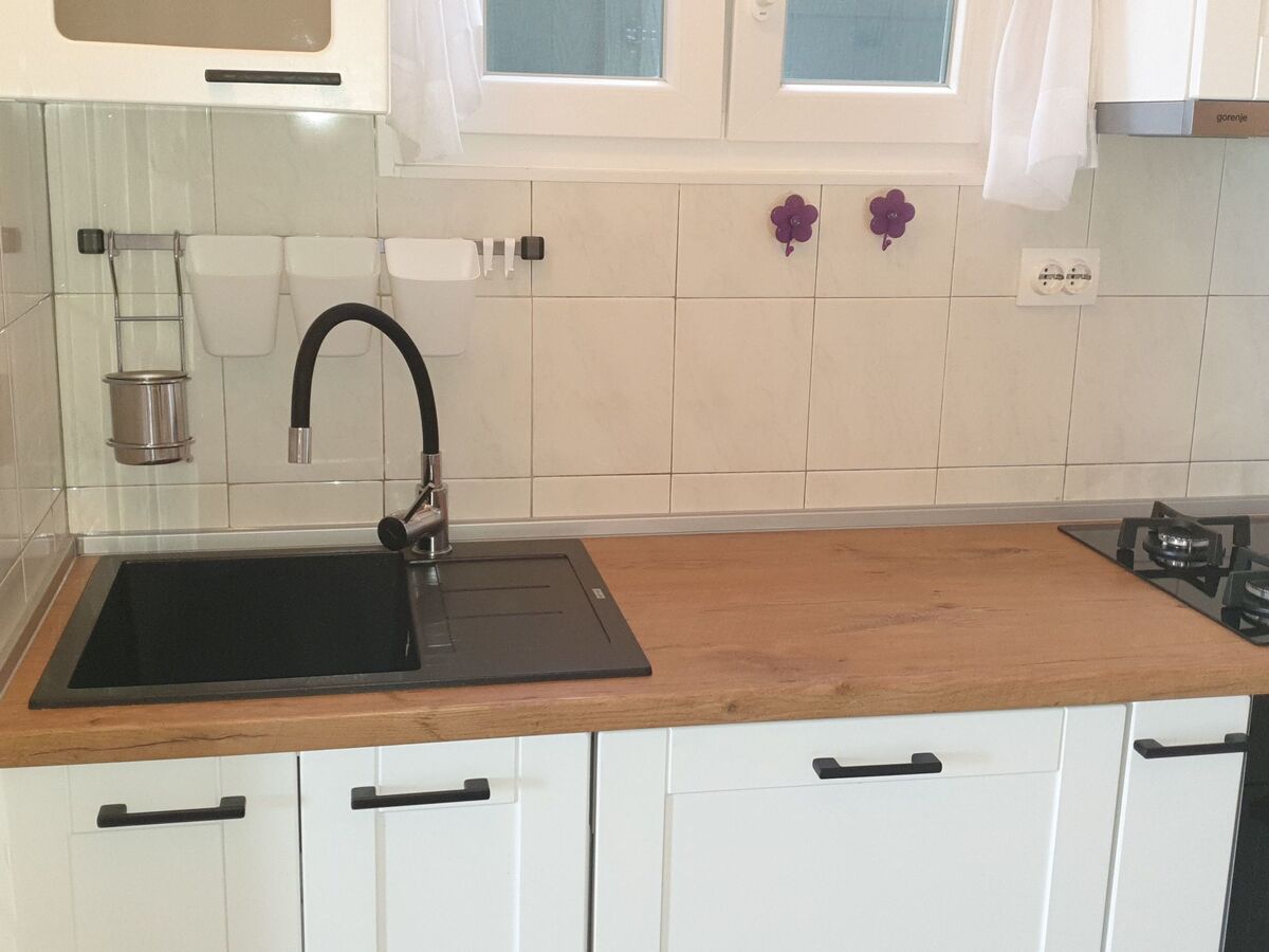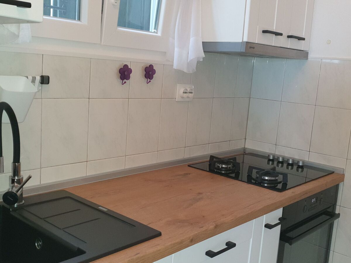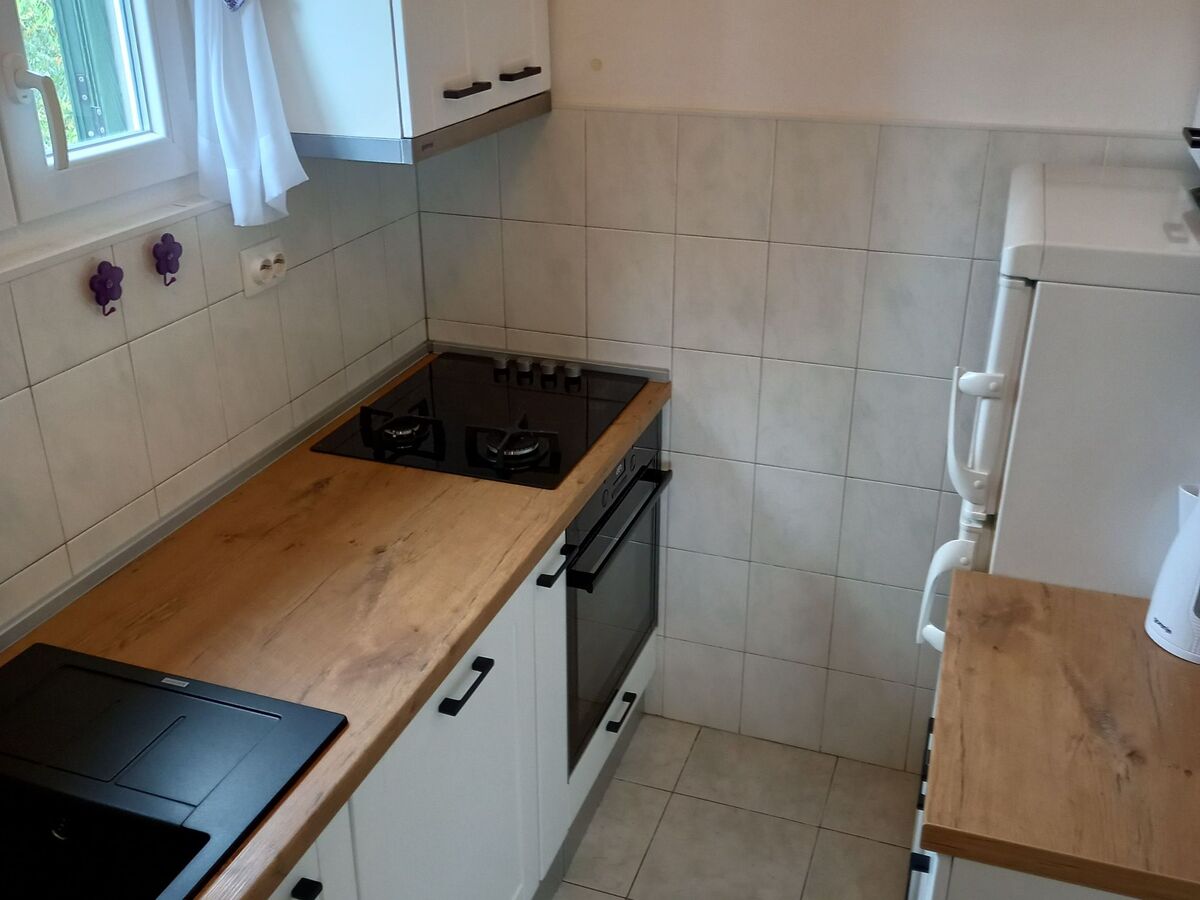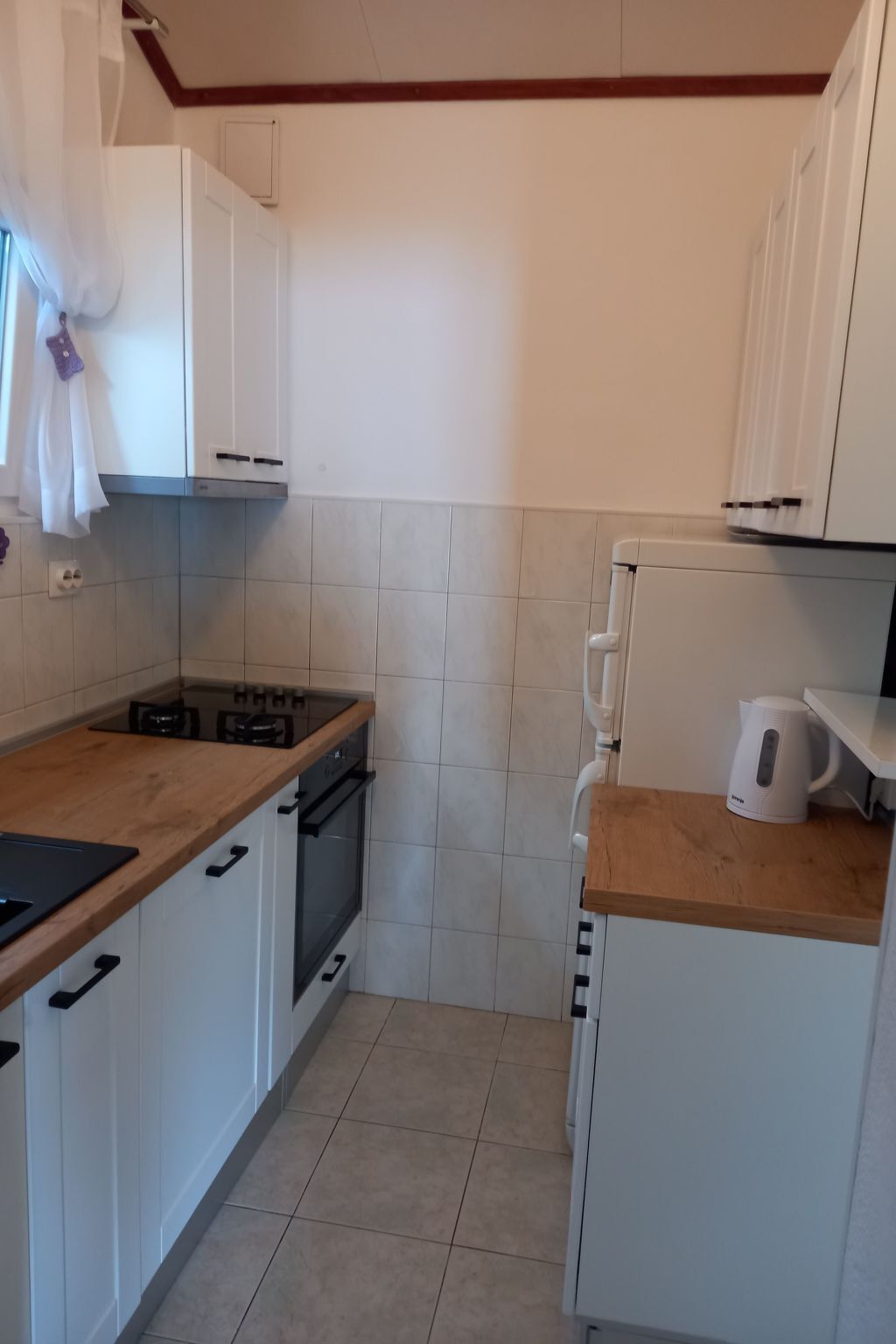 Next to it there is the separate kitchen with a hob, oven, fridge, dishwasher, kettle and cooking utensils.