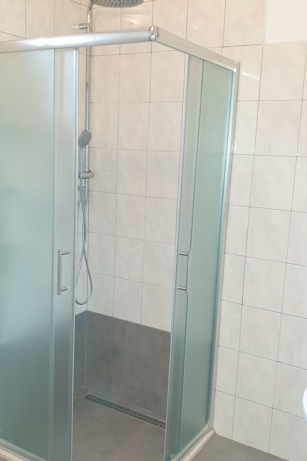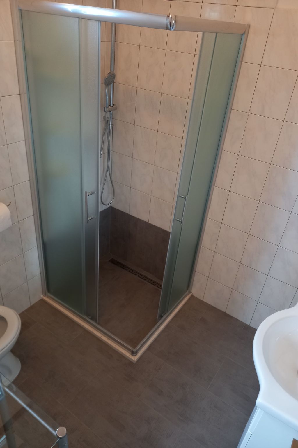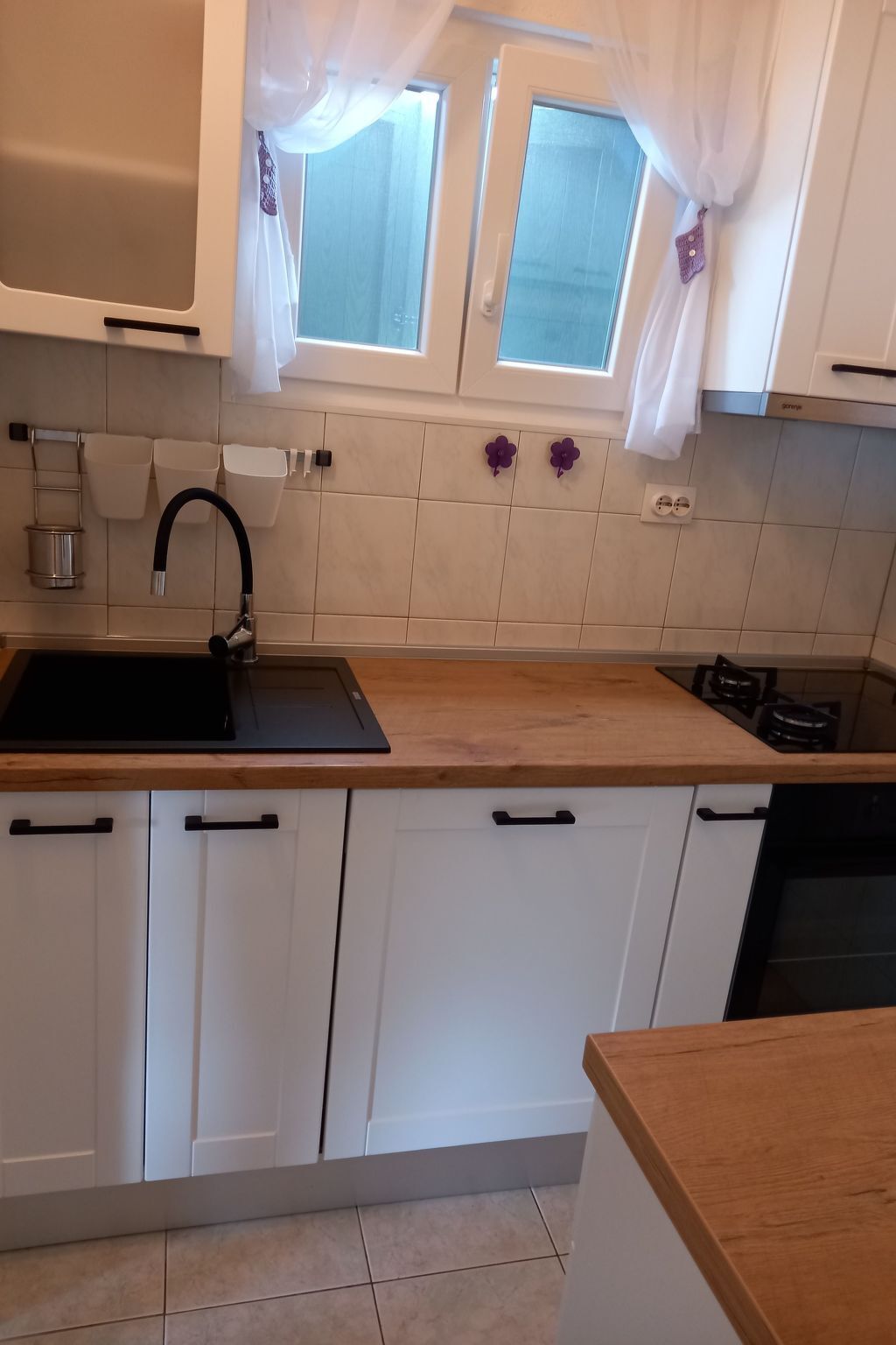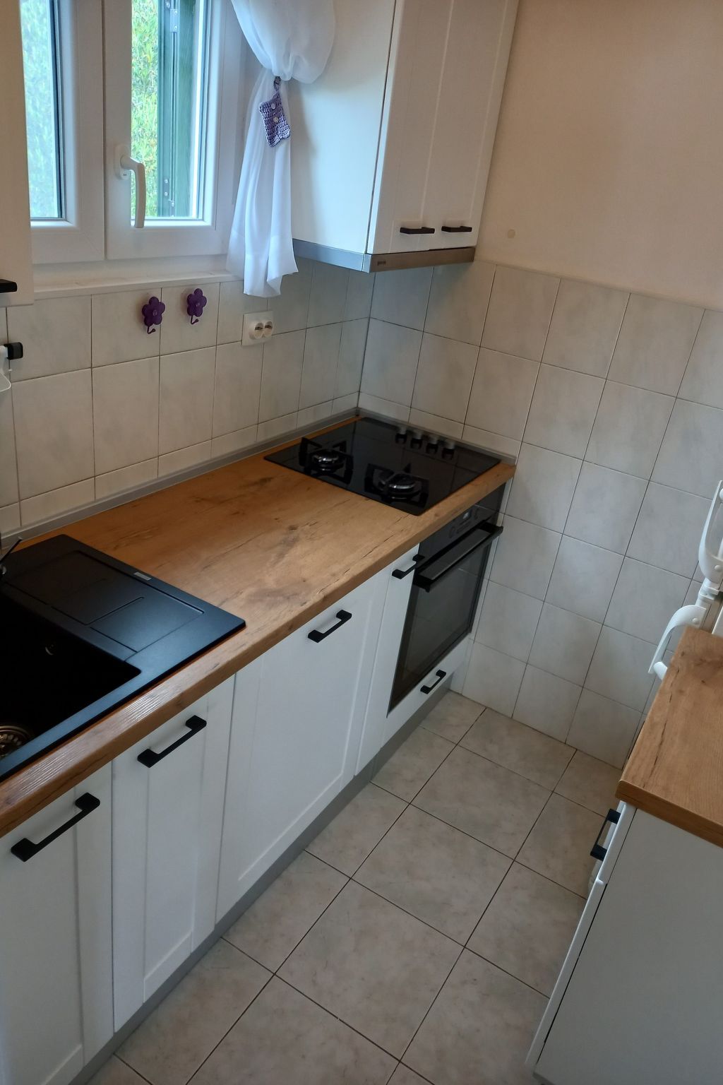 Next to it there is the separate kitchen with a hob, oven, fridge, dishwasher, kettle and cooking utensils.
