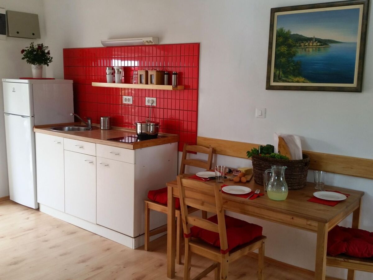 There is a cooking niche integrated into the living room with many appliances (fridge, microwave, toaster, coffee machine…), a full set of crockery, and a dining table with chairs.