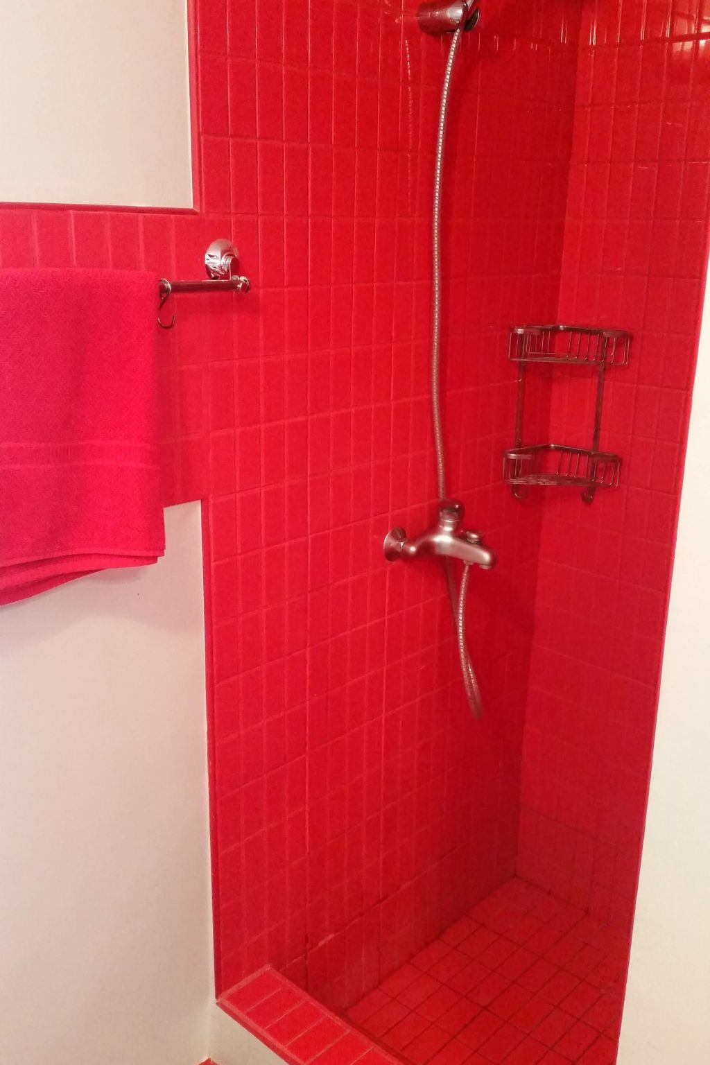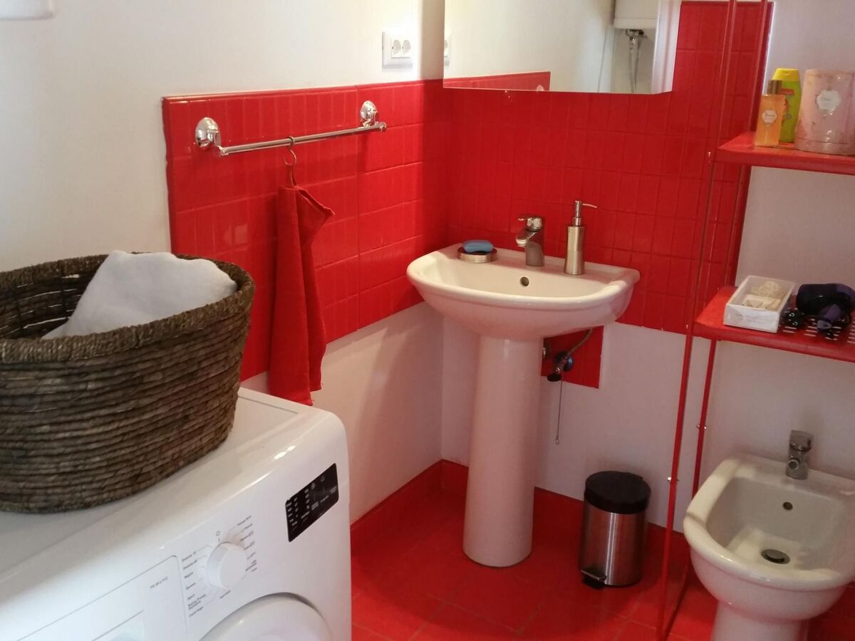 Below there is a relatively big bathroom with a shower, washbasin, WC and washing machine.