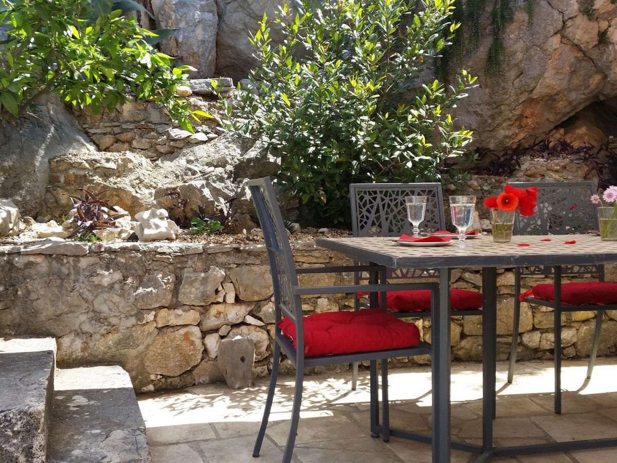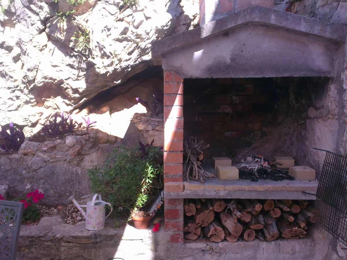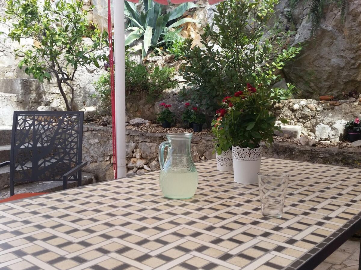 The house opens directly onto a shaded interior courtyard with a dining table and a grill and many types of plants typical of the Mediterranean region.
