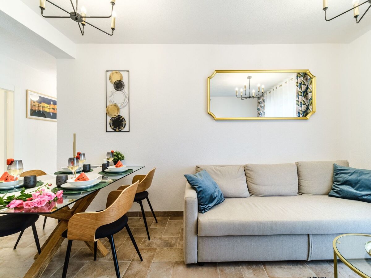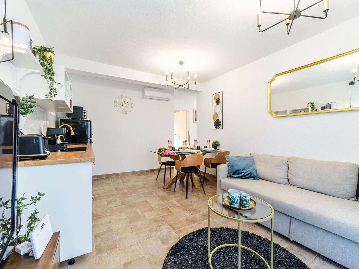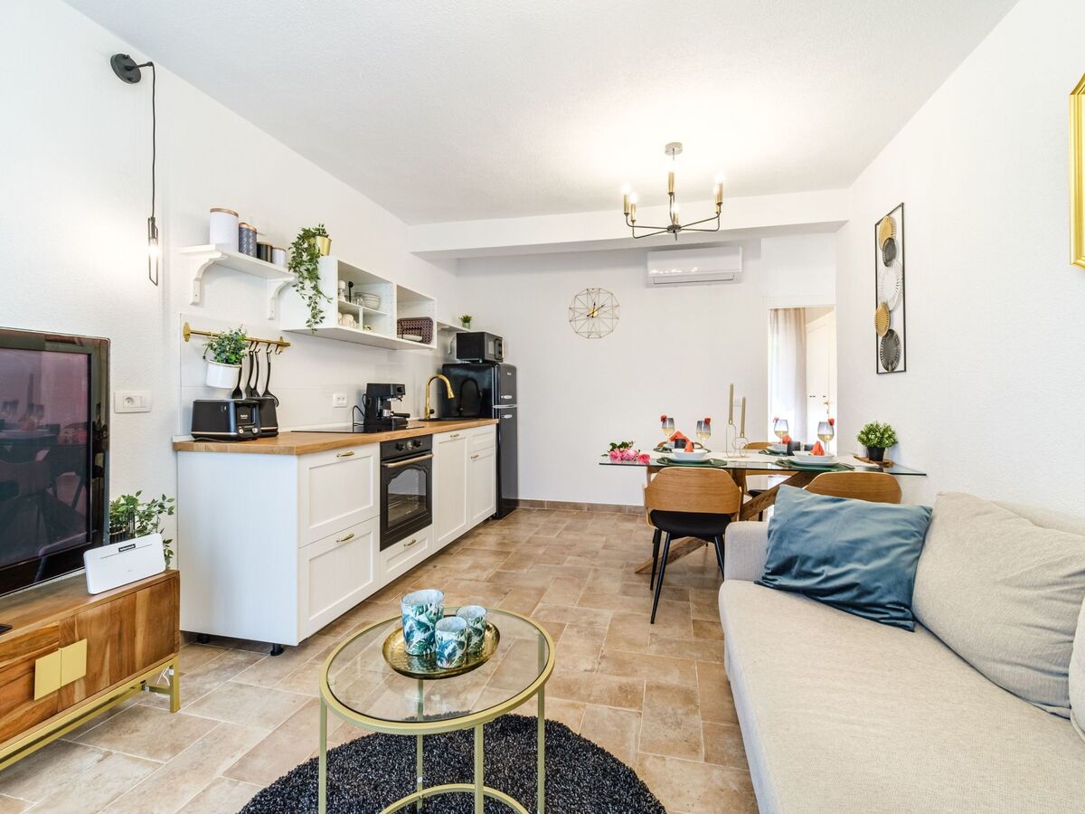 La cuisine est entièrement équipée et reliée à la salle à manger, créant ainsi un espace ouvert qui se prolonge dans le salon avec un canapé confortable et une télévision.