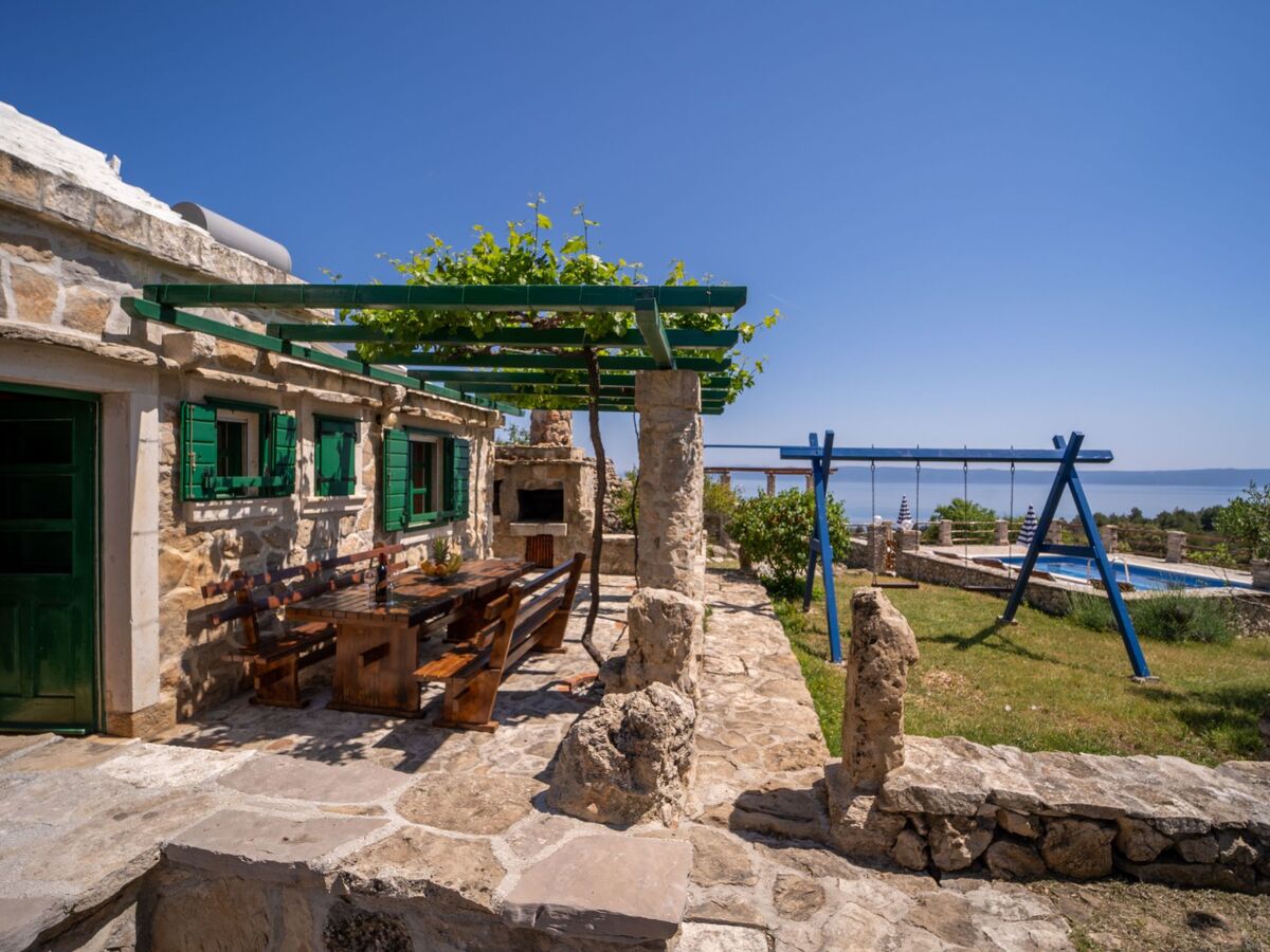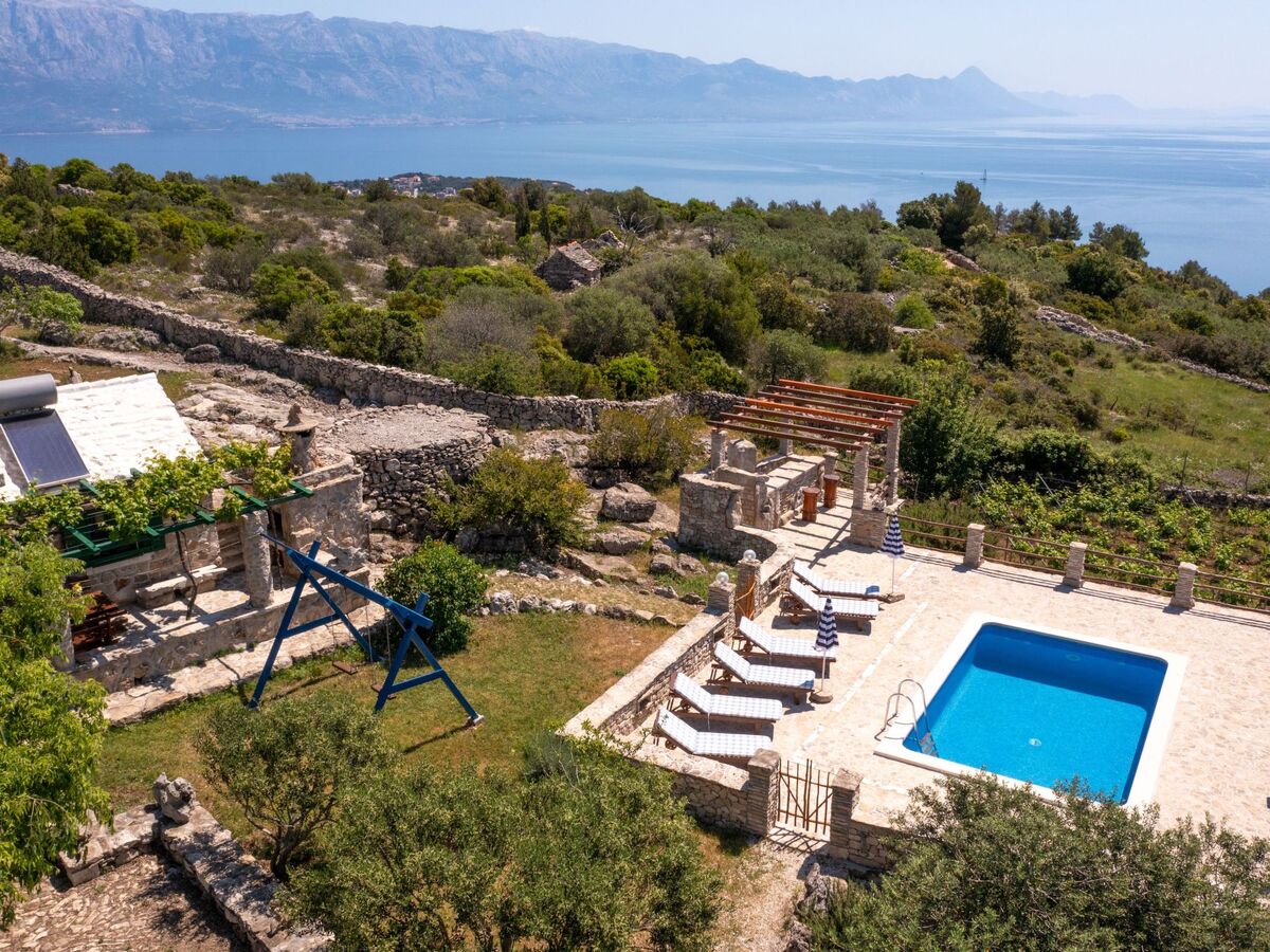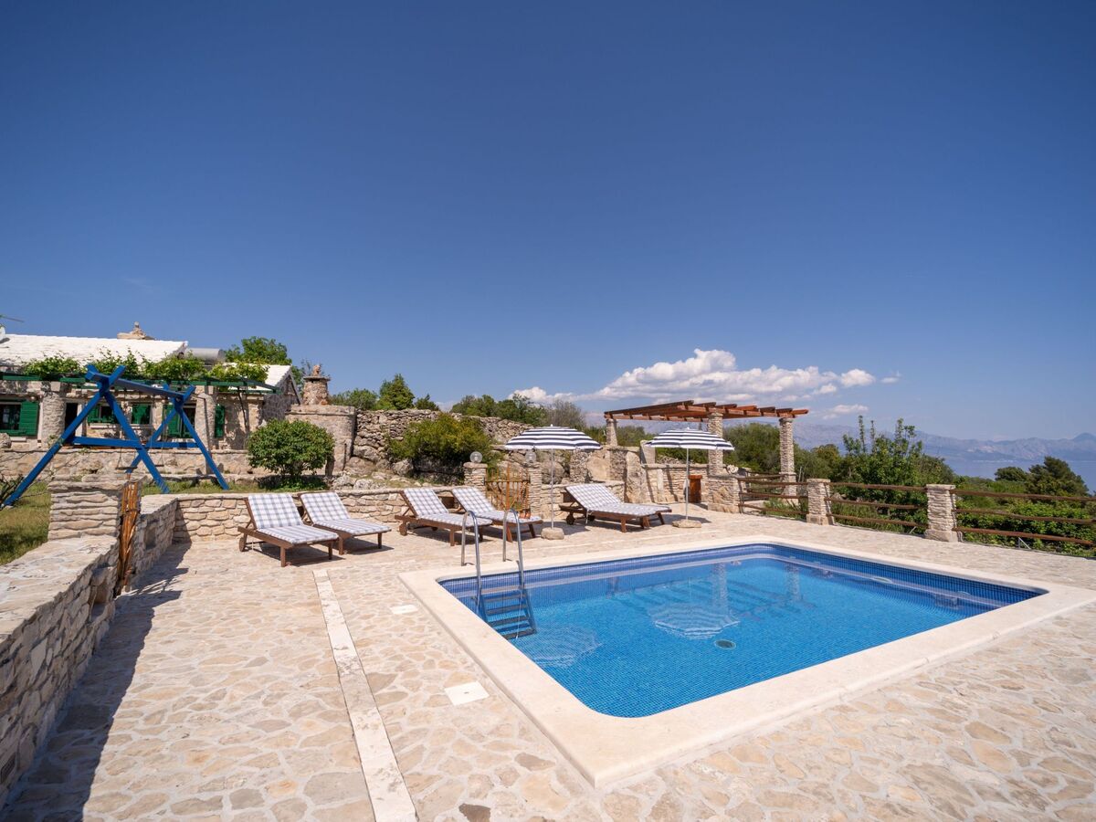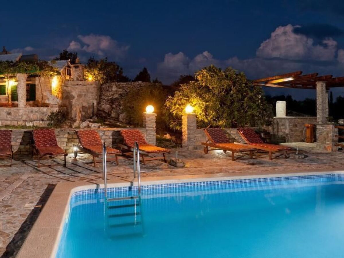 Romantic country house made of natural stone, built in a traditional style, with a spectacular panoramic view of the sea and mountains from the private pool illuminated at night, with an outdoor shower and outdoor kitchen with a grill area, surrounded by a 10,000 m² private property. Ranch Visoka can be easily reached by car, though part of the way is a gravel path. Despite the romantic and secluded location, you are not completely isolated. The owner lives nearby and can be contacted by telephone at any time to assist with any queries. In May, June, September, and October, there is a possibility of renting a second house for two additional people. • electricity and hot water are supplied by its own solar panels • charmingly planted little vegetable garden • secure parking spaces right in front of the villa • outdoor kitchen with a traditional stone grill • a flatscreen TV mounted on the wall with satellite channels • air-conditioned living room • washing machine nearby • kitchens are equipped with a stove, oven, fridge with freezer compartment and plenty of crockery and cutlery • double bed measuring 170 x 200cm • bunk beds 90 x 200cm • plenty of bed linen and towels • a reliable wireless Internet connection can be used free of charge • 1 km away from the nearest beach with crystal clear water • 3 km to the centre of the little harbour town of Sumartin, with a range of shops, colourful markets, and good gastronomy • pet friendly Basic information - Pets allowed: 2 - type of building: Detached house - size of property: 10000 m² - Number of bedrooms: 2 - Number of bathrooms: 2 Top features - WiFi - air conditioning: In part - garden: For sole use - outdoor pool - ㄴ for sole use - ㄴ maximum depth: 150 cm - ㄴ length: 550 cm - ㄴ width: 350 cm - Total of private car parking spaces: 2 - ㄴ of which garage spaces: 1 - ㄴ of which private outdoor parking spaces: 2 Sleeping bedroom 2 - double bed (1.80 m width) bedroom 4 - bunk bed Bathroom bathroom 2 - shower bathroom 4 - shower Cooking/Living - fridge/freezer: deep freezer, fridge - oven - fireplace Entertainment - TV: TV Utility - fan: 1 Outside area - veranda - grill/barbecue: grill/barbecue - outside shower Surroundings - view: mountain, sea/lake, garden, forrest, lawn - directly at the edge of the wood - Nearest town centre: 2,5 km - Grocery store: 2,5 km - restaurant: 2,0 km - beach: 1,6 km - sea: 1,0 km Distinctive features - farm house holiday - finca - vineyard - Agritourism - Suitable for fishing