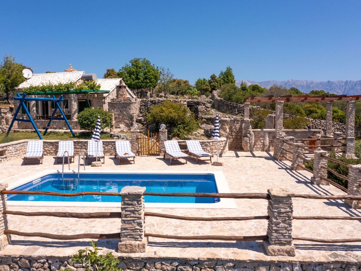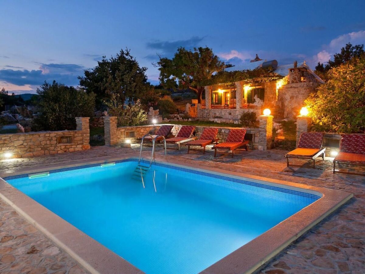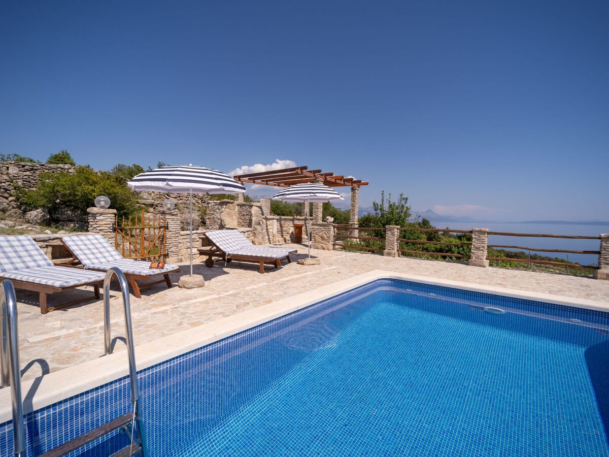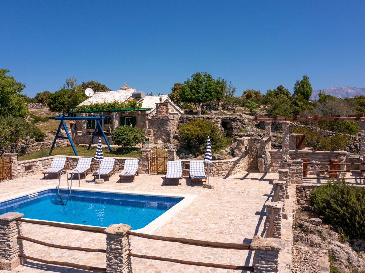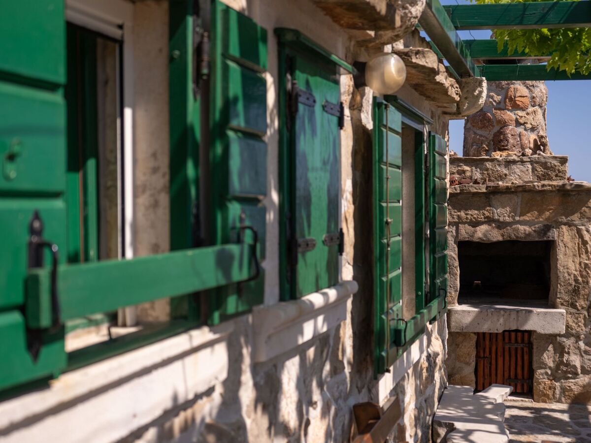 Romantic country house made of natural stone, built in a traditional style, with a spectacular panoramic view of the sea and mountains from the private pool illuminated at night, with an outdoor shower and outdoor kitchen with a grill area, surrounded by a 10,000 m² private property. Ranch Visoka can be easily reached by car, though part of the way is a gravel path. Despite the romantic and secluded location, you are not completely isolated. The owner lives nearby and can be contacted by telephone at any time to assist with any queries. In May, June, September, and October, there is a possibility of renting a second house for two additional people. • electricity and hot water are supplied by its own solar panels • charmingly planted little vegetable garden • secure parking spaces right in front of the villa • outdoor kitchen with a traditional stone grill • a flatscreen TV mounted on the wall with satellite channels • air-conditioned living room • washing machine nearby • kitchens are equipped with a stove, oven, fridge with freezer compartment and plenty of crockery and cutlery • double bed measuring 170 x 200cm • bunk beds 90 x 200cm • plenty of bed linen and towels • a reliable wireless Internet connection can be used free of charge • 1 km away from the nearest beach with crystal clear water • 3 km to the centre of the little harbour town of Sumartin, with a range of shops, colourful markets, and good gastronomy • pet friendly Basic information - Pets allowed: 2 - type of building: Detached house - size of property: 10000 m² - Number of bedrooms: 2 - Number of bathrooms: 2 Top features - WiFi - air conditioning: In part - garden: For sole use - outdoor pool - ㄴ for sole use - ㄴ maximum depth: 150 cm - ㄴ length: 550 cm - ㄴ width: 350 cm - Total of private car parking spaces: 2 - ㄴ of which garage spaces: 1 - ㄴ of which private outdoor parking spaces: 2 Sleeping bedroom 2 - double bed (1.80 m width) bedroom 4 - bunk bed Bathroom bathroom 2 - shower bathroom 4 - shower Cooking/Living - fridge/freezer: deep freezer, fridge - oven - fireplace Entertainment - TV: TV Utility - fan: 1 Outside area - veranda - grill/barbecue: grill/barbecue - outside shower Surroundings - view: mountain, sea/lake, garden, forrest, lawn - directly at the edge of the wood - Nearest town centre: 2,5 km - Grocery store: 2,5 km - restaurant: 2,0 km - beach: 1,6 km - sea: 1,0 km Distinctive features - farm house holiday - finca - vineyard - Agritourism - Suitable for fishing