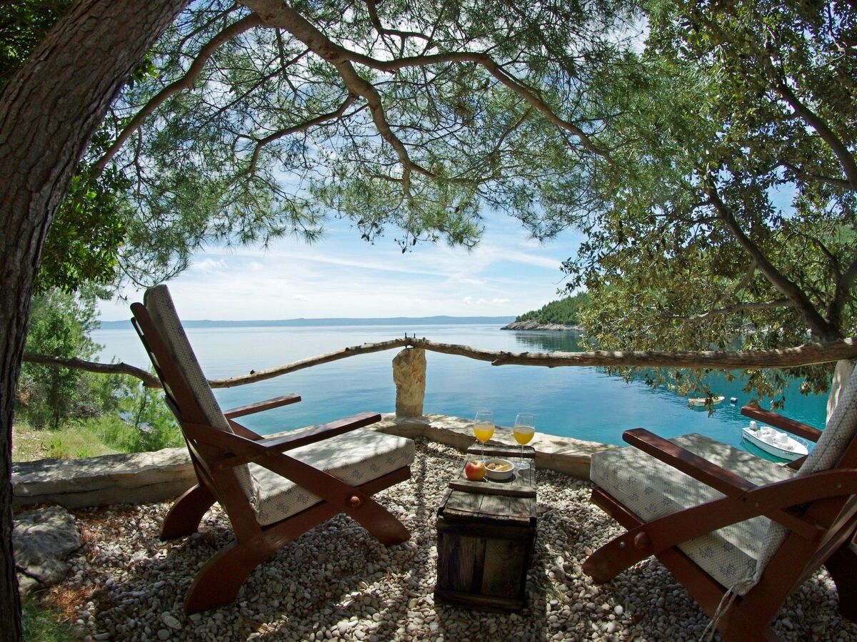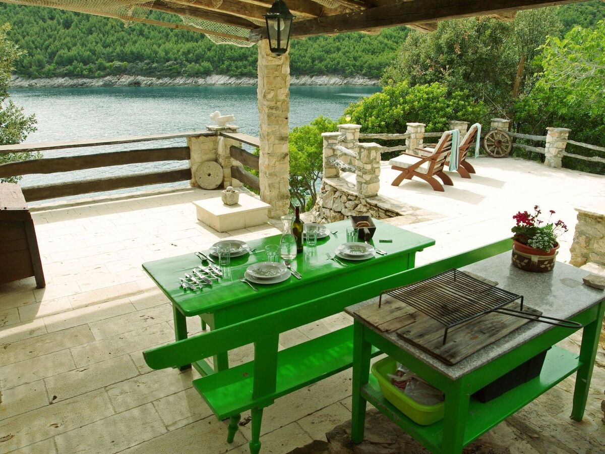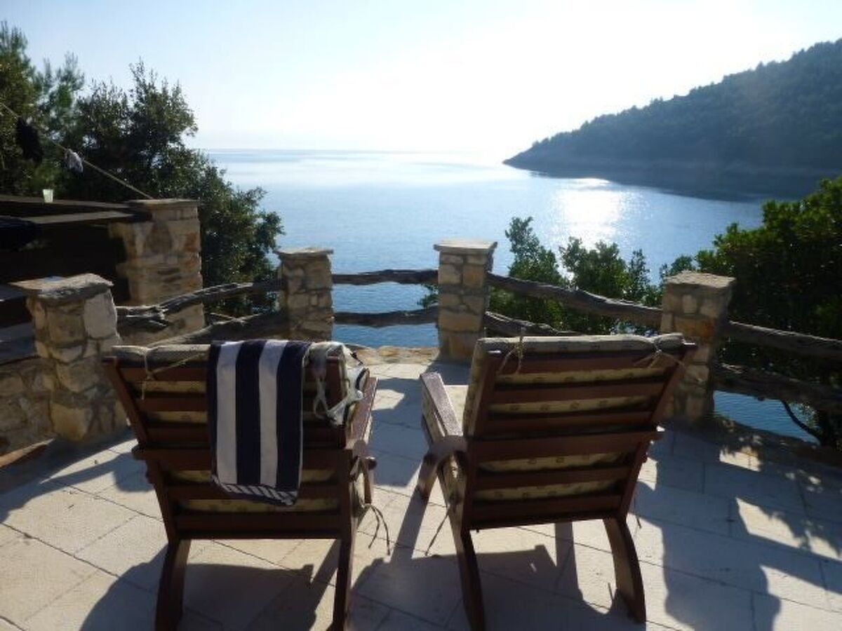 Le terrain de 5000 m² est situé dans une baie en bord de mer et dispose de plusieurs terrasses avec vue sur la mer, ainsi que d'un barbecue (bois de chauffage fourni gratuitement) et d'une table à manger avec banc.