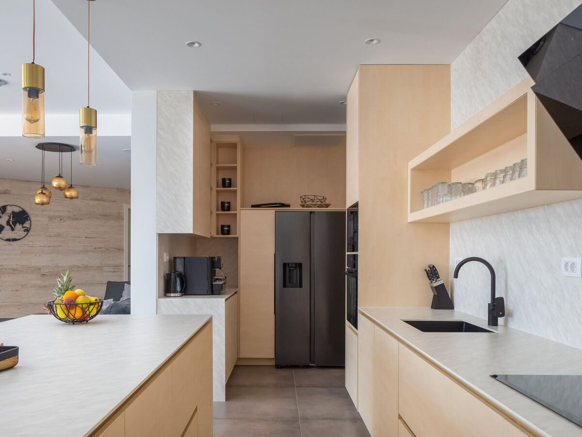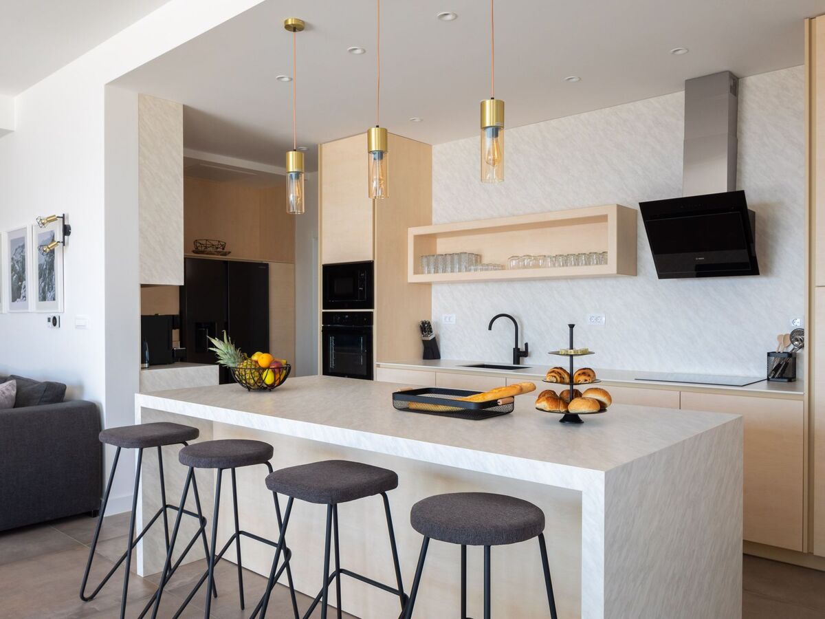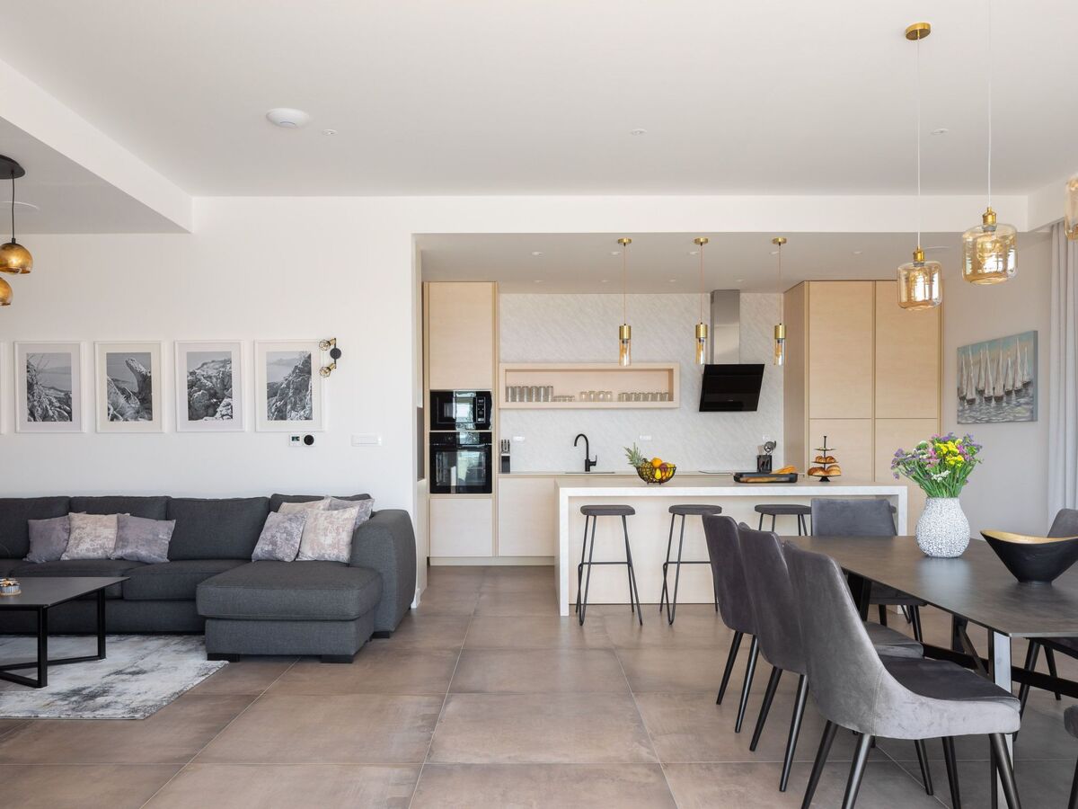 The living room, fully equipped kitchen, and indoor dining area are connected and designed to complement and enrich each other, and there is an outdoor dining area for 10 people.