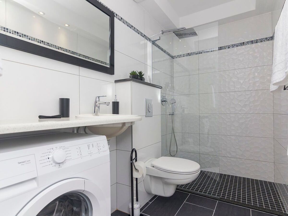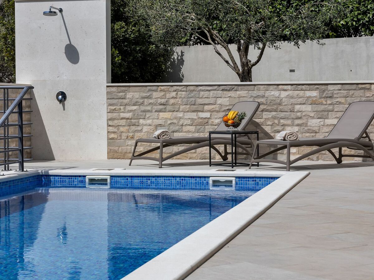 From the ground floor you can access the pool terrace with a heated pool, sun loungers and an outdoor shower.