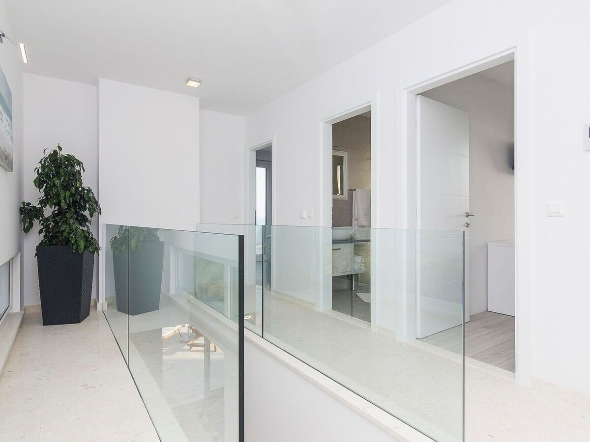 On the ground floor there is a modern living room with access to the pool (heated) and terrace with sea views, an open-plan kitchen.