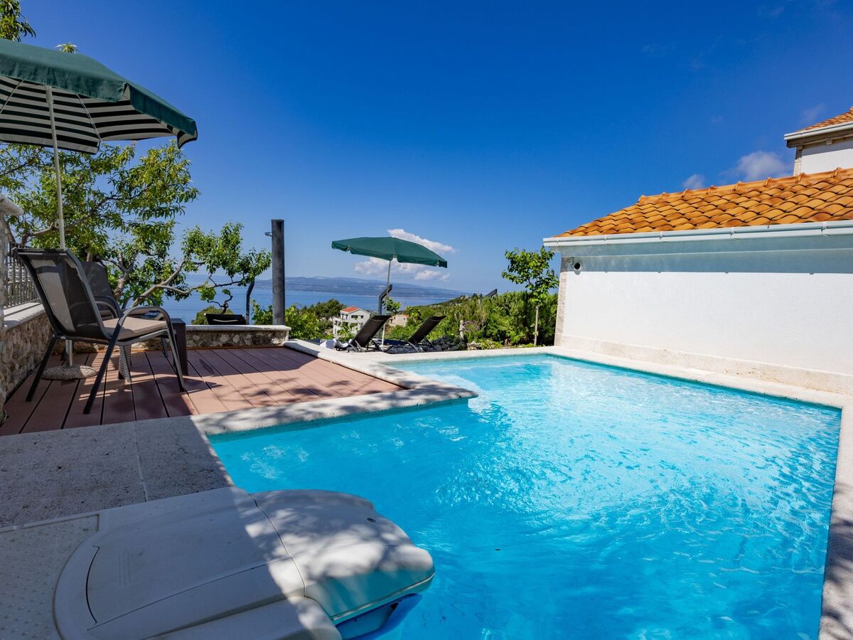 The private pool with wooden deck offers a marvellous view of the sea and the islands.
