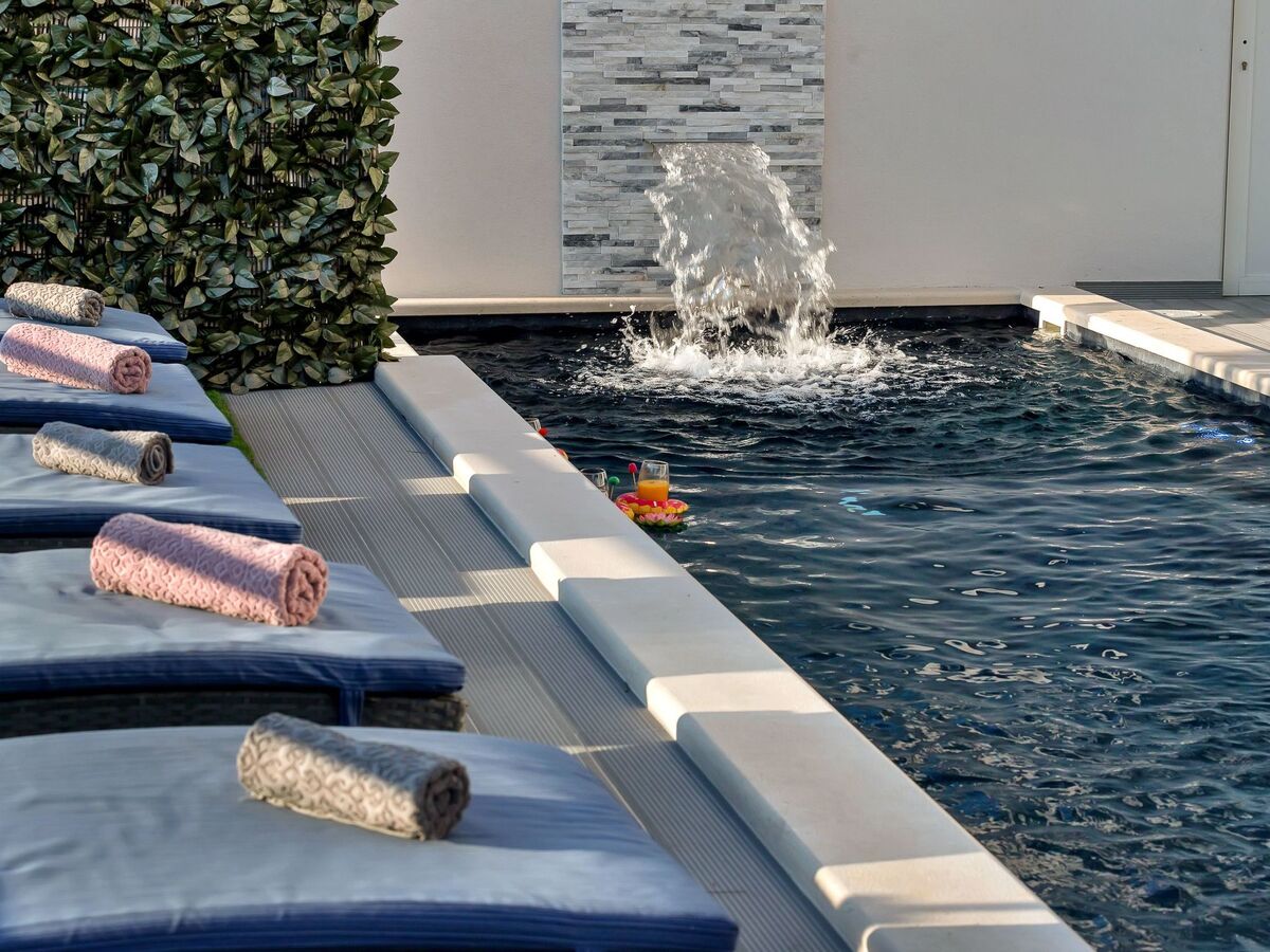 The outdoor pool with sea view, 2.5 m x 8.5 m, depth 1.50 m, is just 300 m from the front door, with shops and restaurants 700 metres away.
