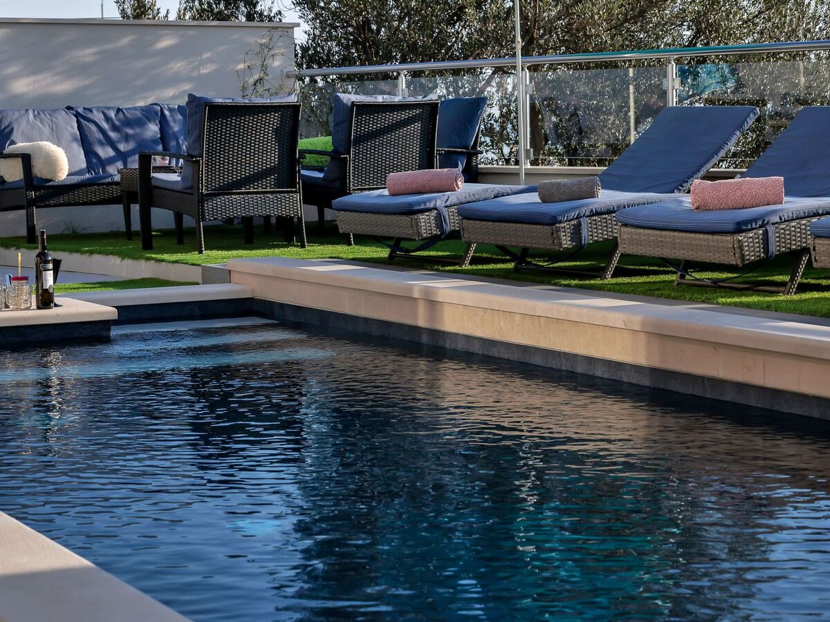 Beautiful terrace with pool and sea view, outdoor shower, barbecue area.