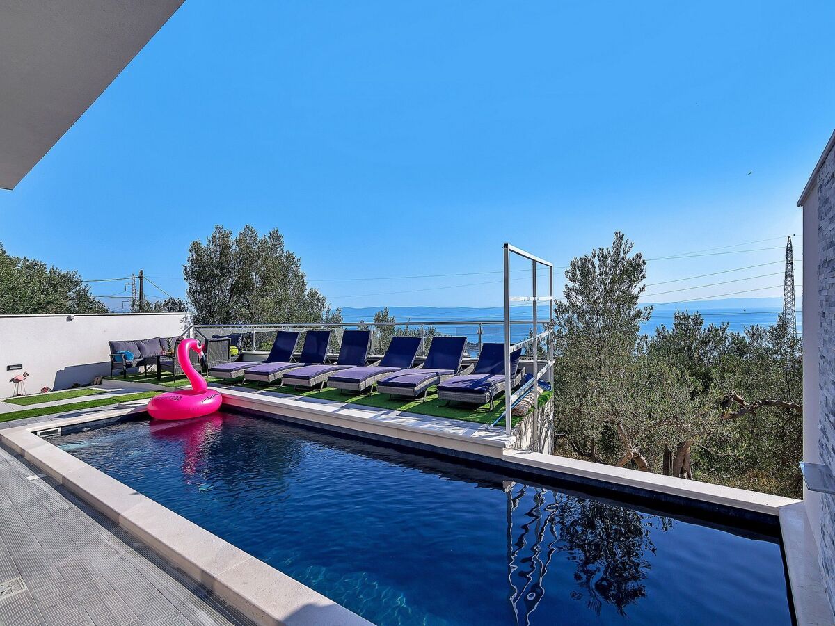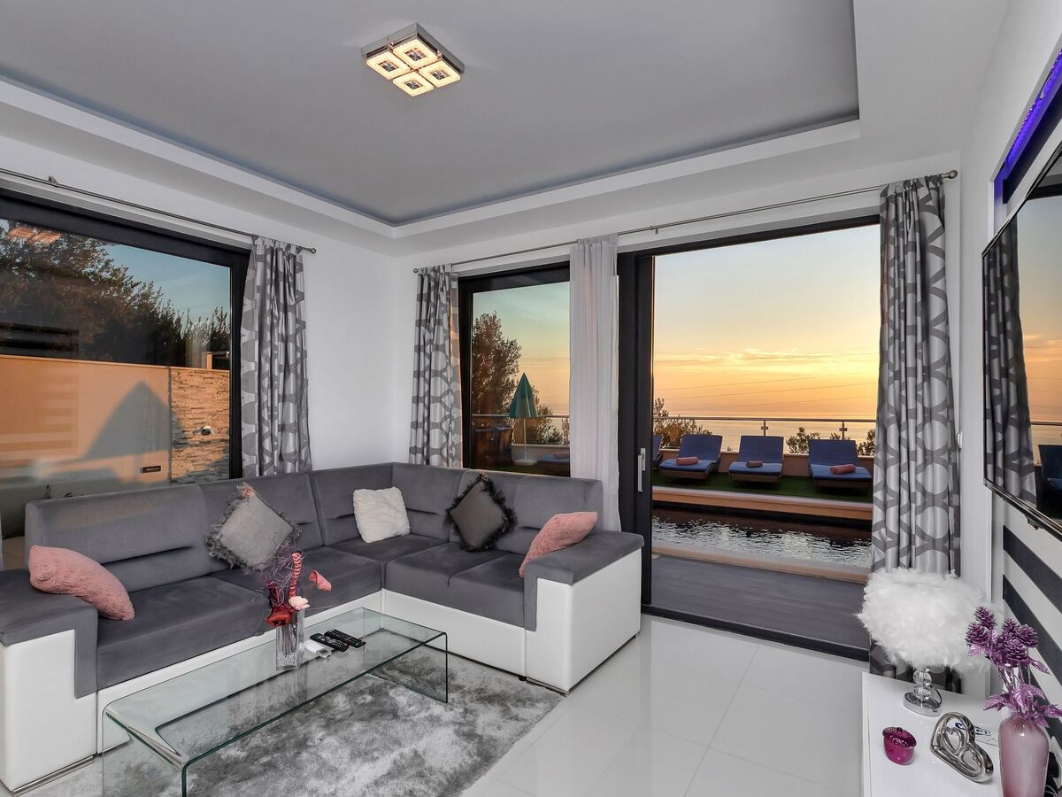The spacious living area with open-plan kitchen, beautiful terrace with pool and sea views, sun loungers, an outdoor shower and barbecue area.