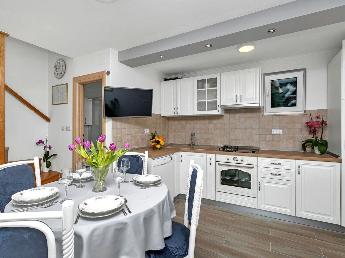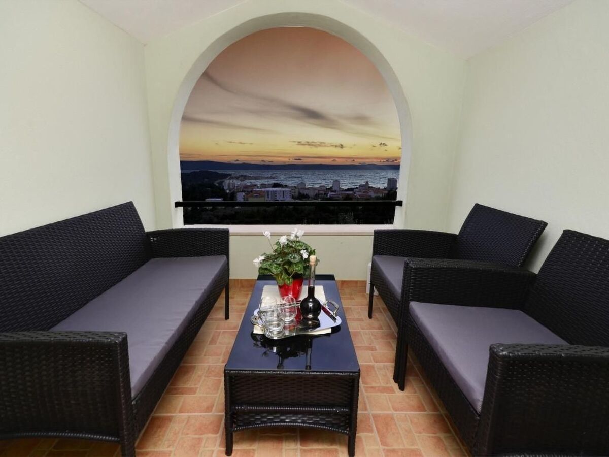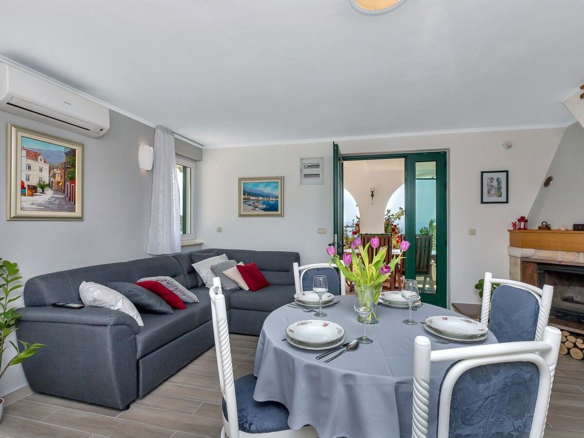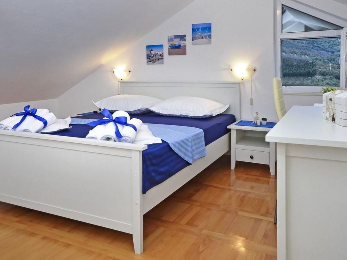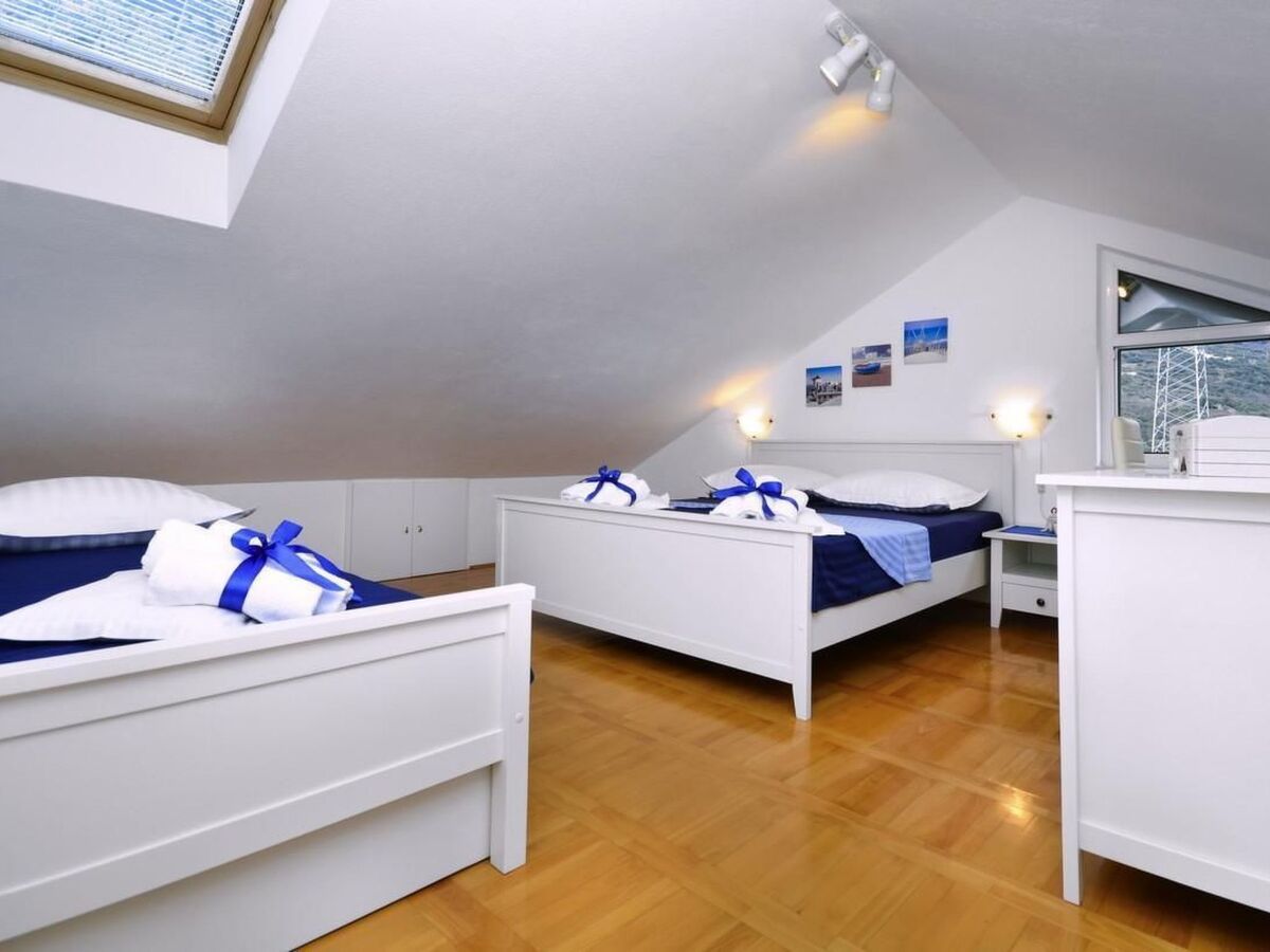 On the first floor there is a bedroom with a double bed and a single bed, a loggia with a seating area and a view of the sea and the town of Makarska.