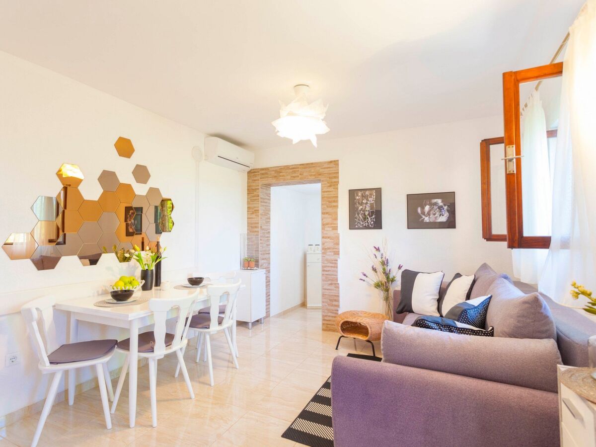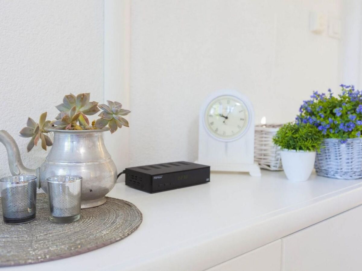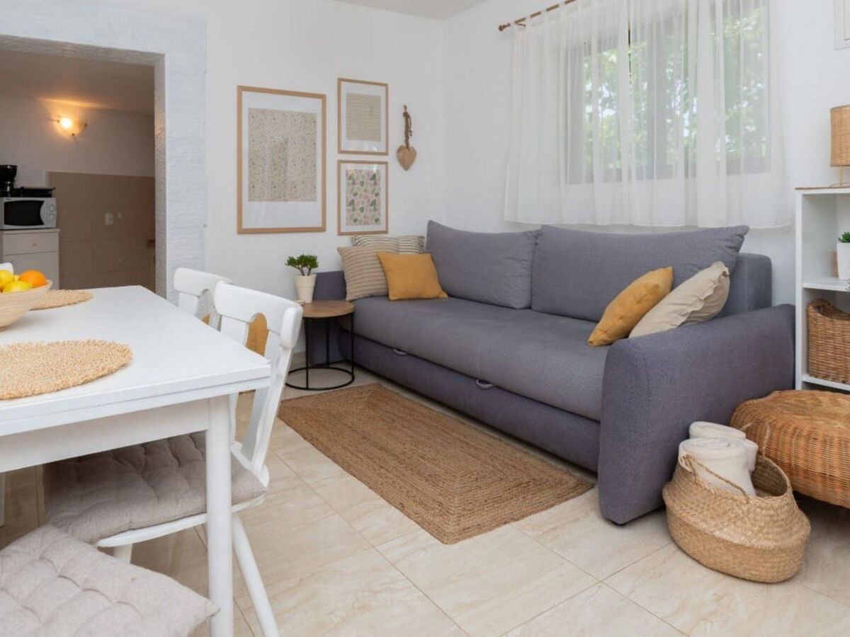 The interior of the house is cosy and functional: a living room with sofa (suitable for a child), dining area and satellite TV flows seamlessly into the small, well-equipped kitchen.