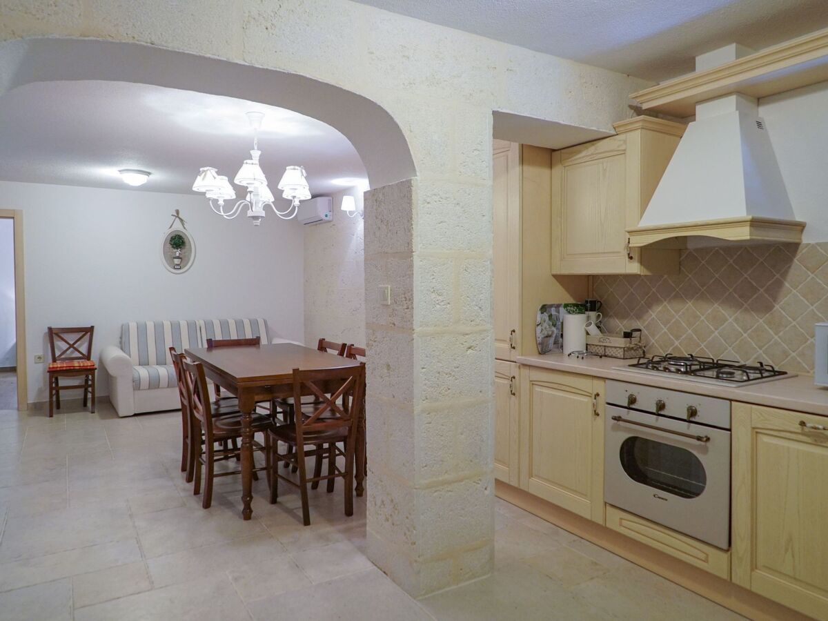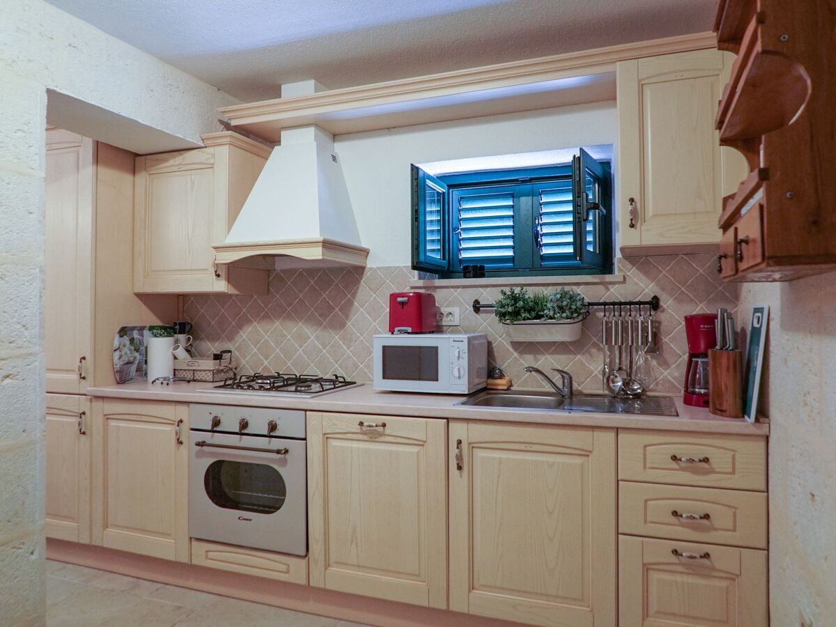 The cream-coloured built-in kitchen next to it is equipped with the latest appliances: dishwasher, four-zone gas stove with an elegant cooker hood, oven, fridge with freezer compartment and toaster.