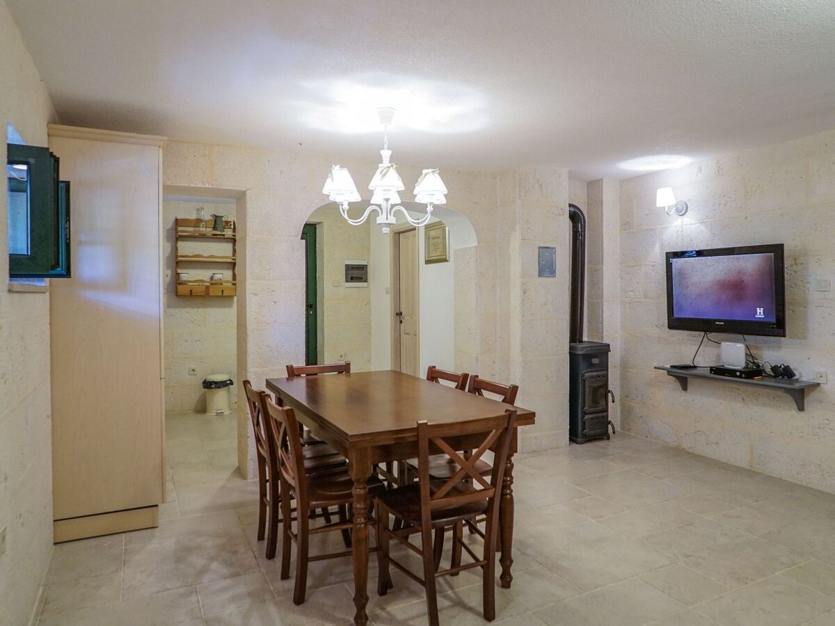 The living room downstairs provides a comfortable sofa, a wall-mounted flatscreen TV with satellite channels and a dining table with six chairs.