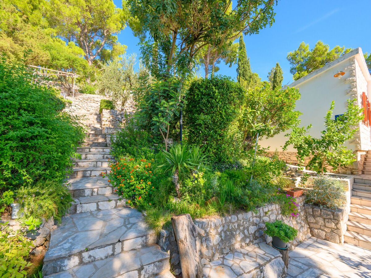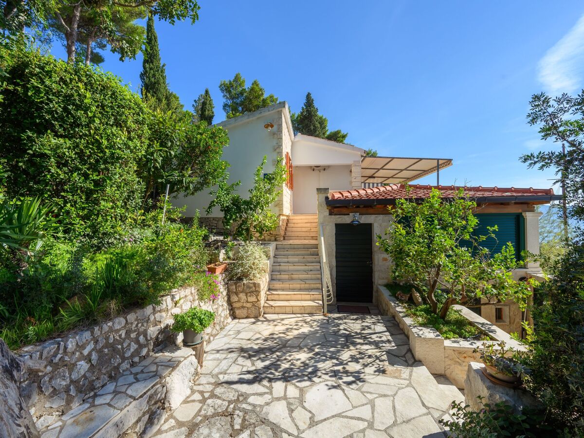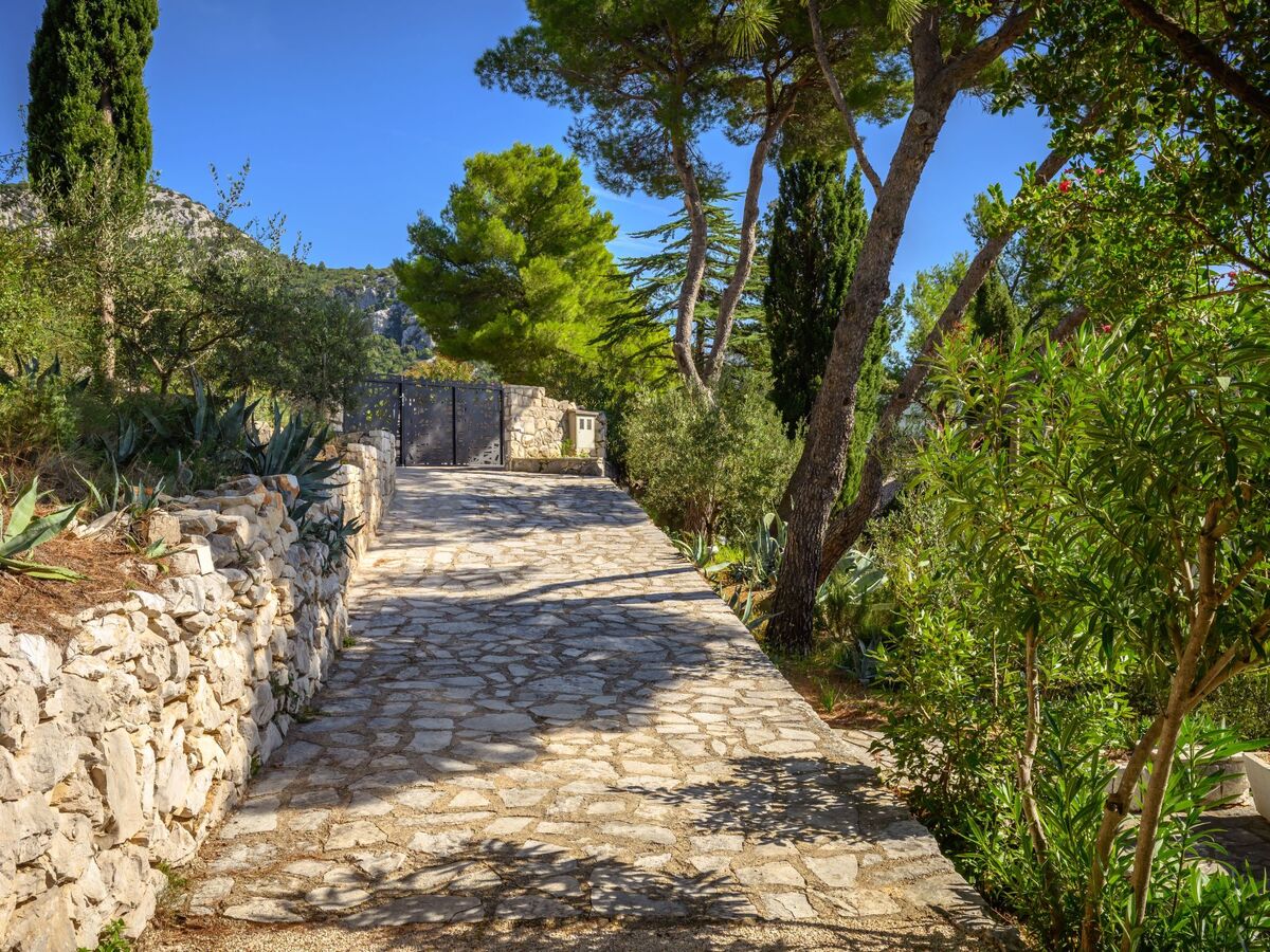 The home is enveloped in lush Mediterranean vegetation, featuring oleander, lemon, and olive trees, pines, and an assortment of herbs, creating a tranquil and aromatic outdoor oasis.