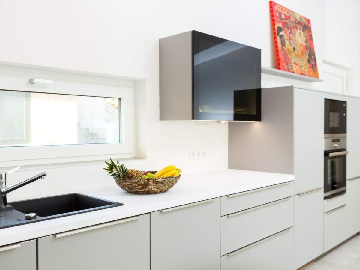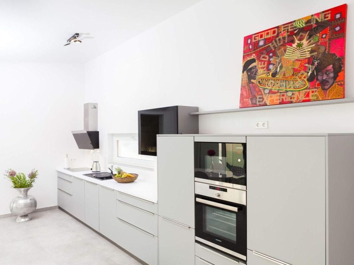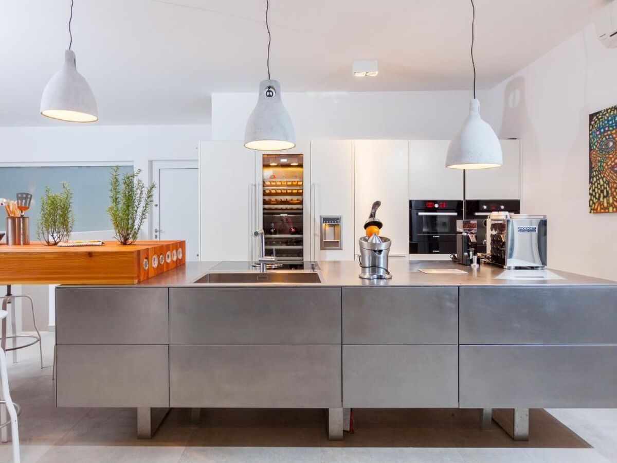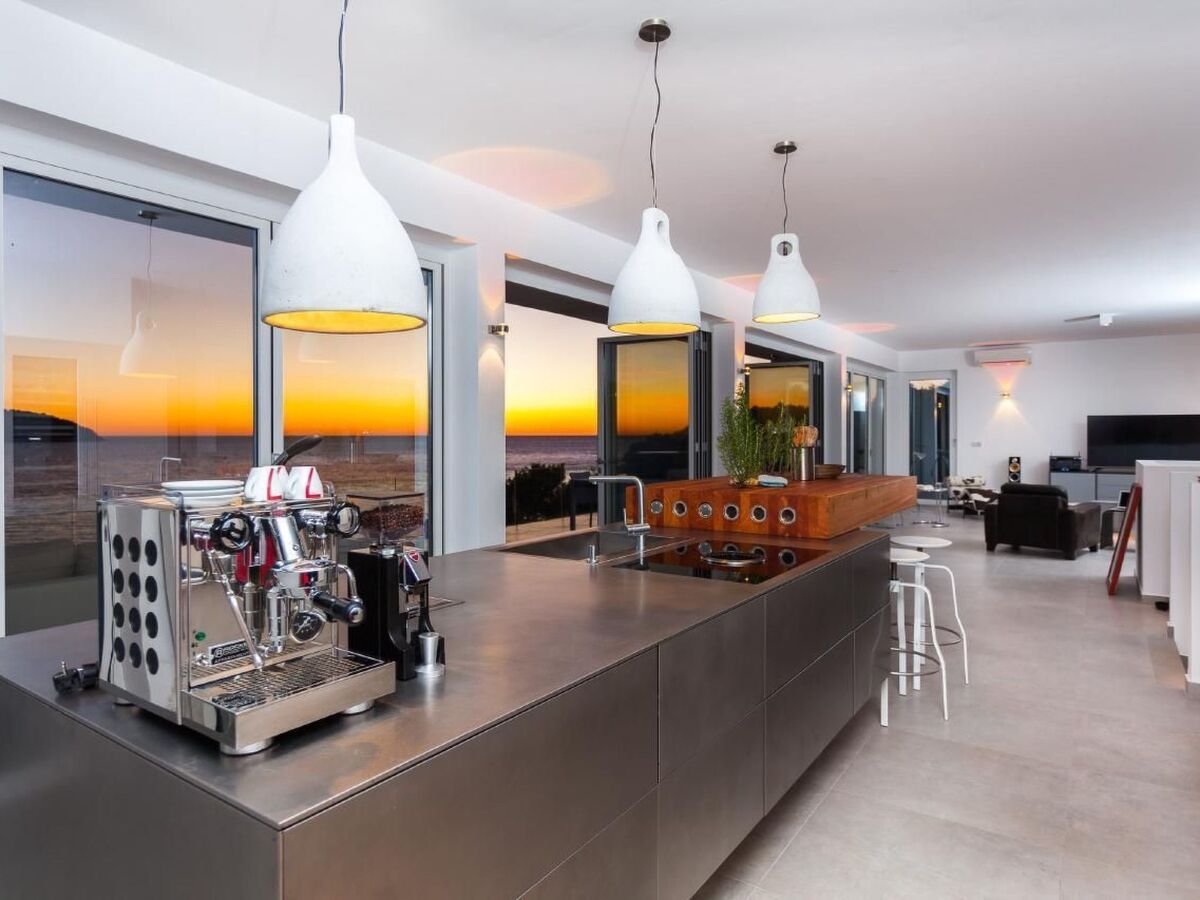 The designer kitchen is equipped with the highest quality appliances, such as a Gaggenau wine fridge, freezer with ice cube maker, TOP espresso machine with milk frother and a variety of modern kitchen appliances.