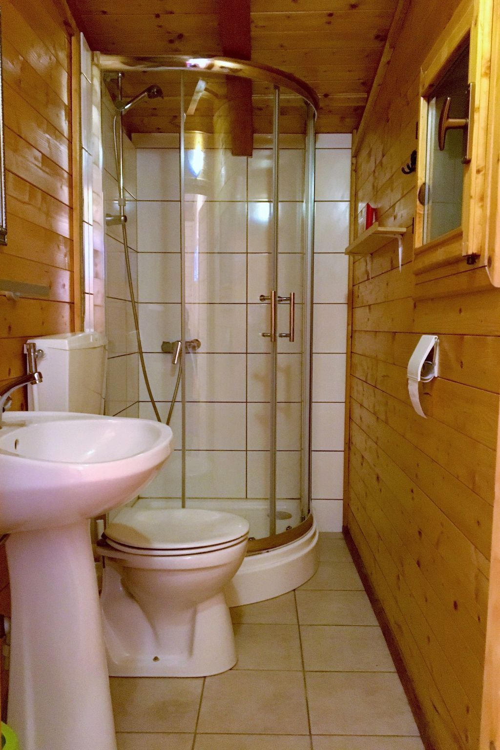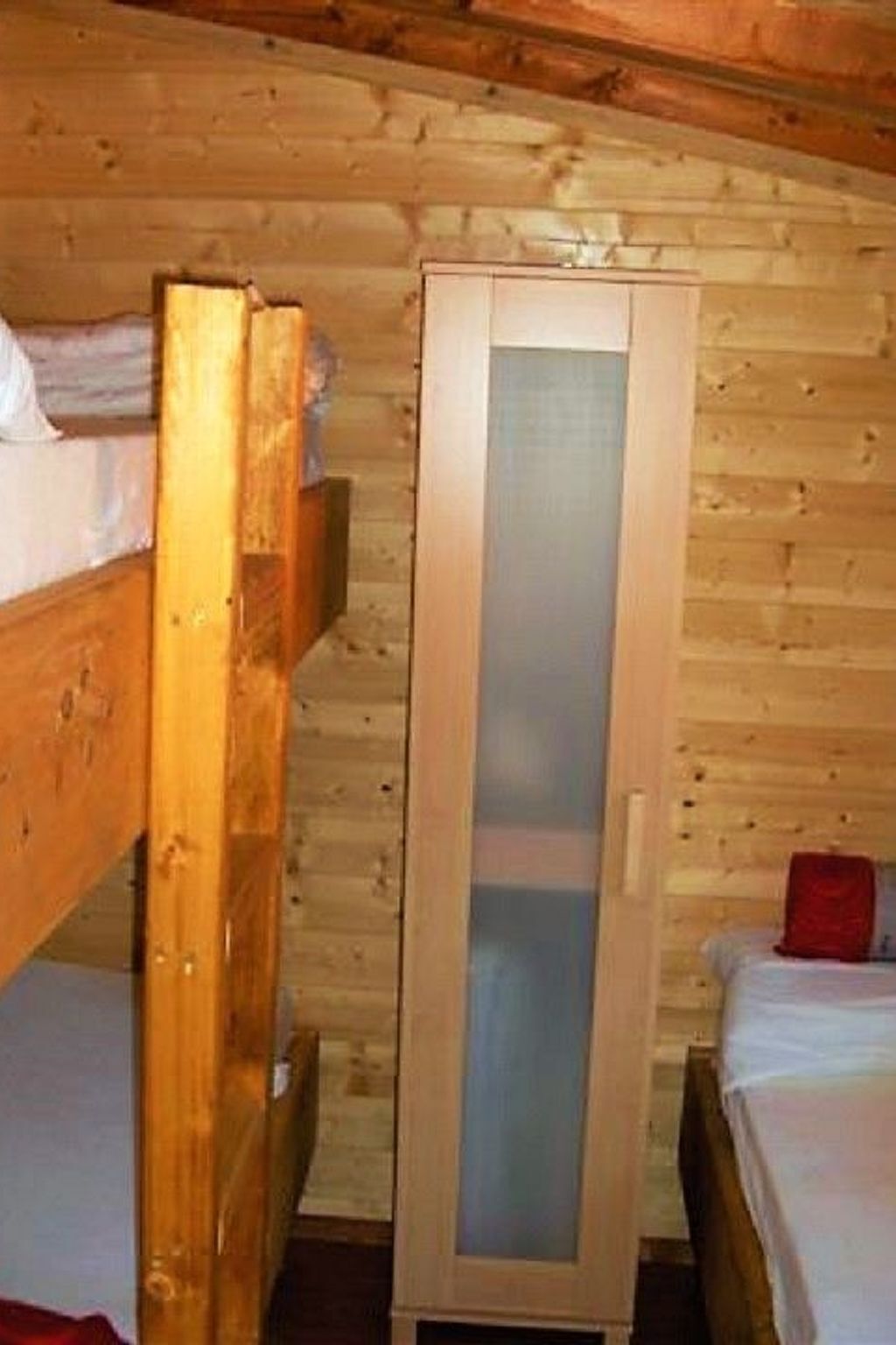 Each chalet is equipped with two bedrooms; one with a double bed and the other with three single beds, including a bunk bed, to comfortably accommodate up to five people.