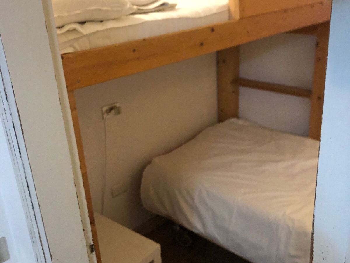 The first floor comprises a bedroom with a double bed, a bedroom with a bunk bed and a bathroom with a bath.