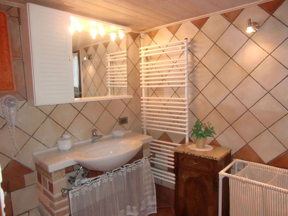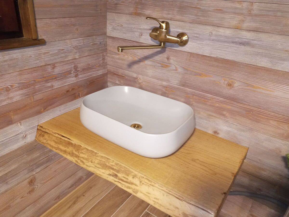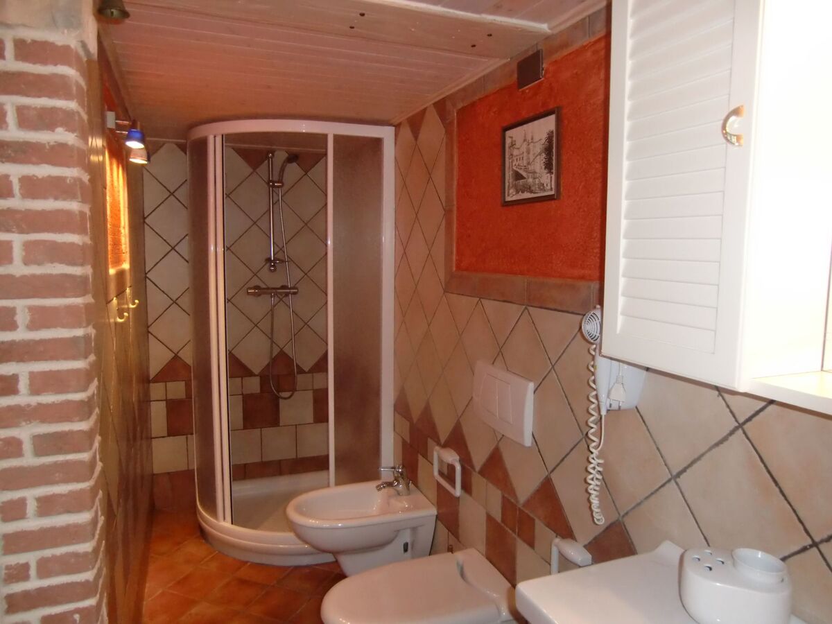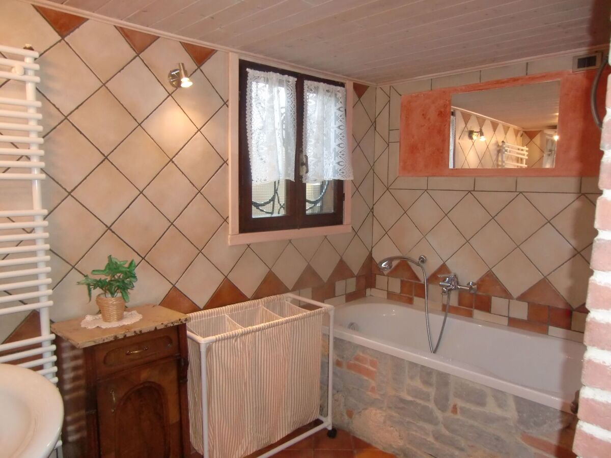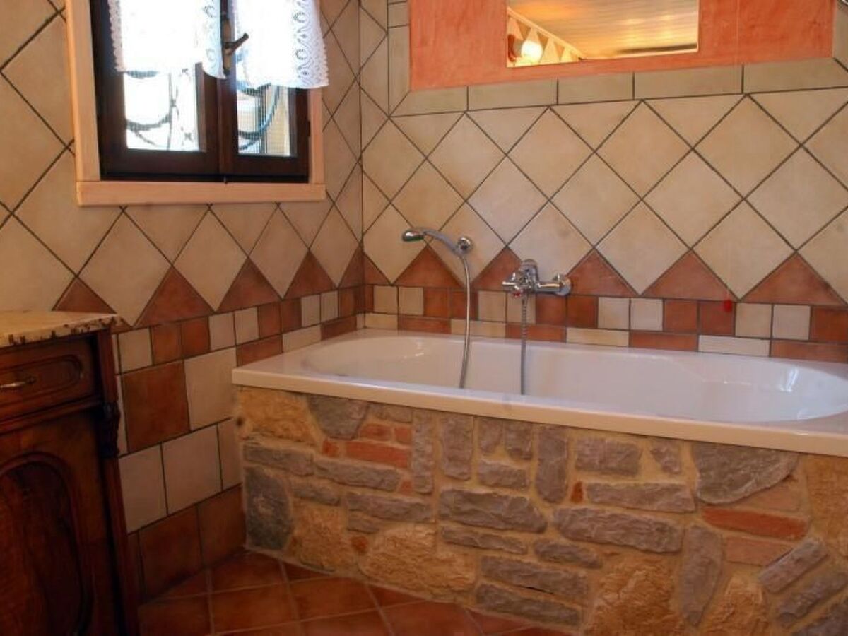 The main bathroom, decorated in rustic style with stone cladding, includes a modern shower stall and bathtub, while a second bathroom is equally well equipped.