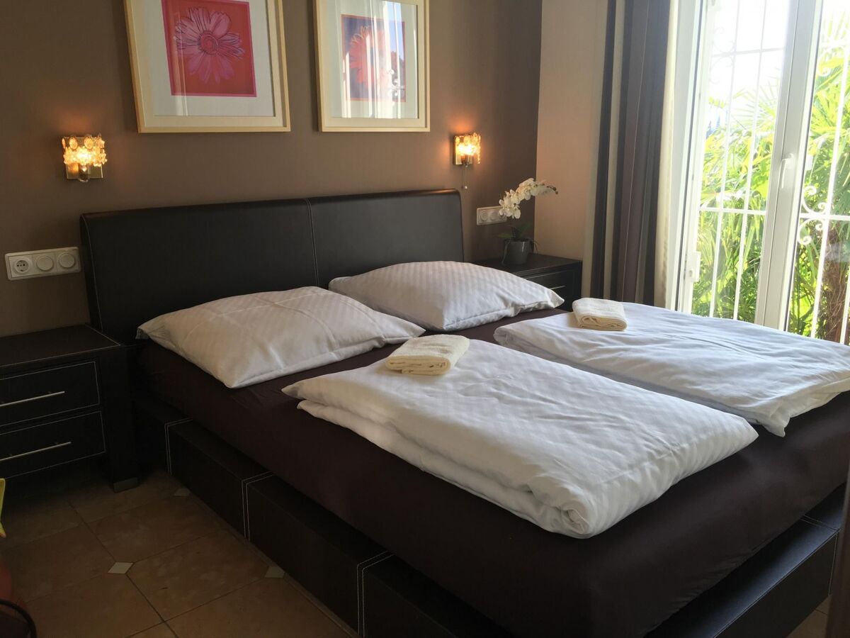 The completely fenced garden of 600m² with a big palm tree is right in front of the terrace.