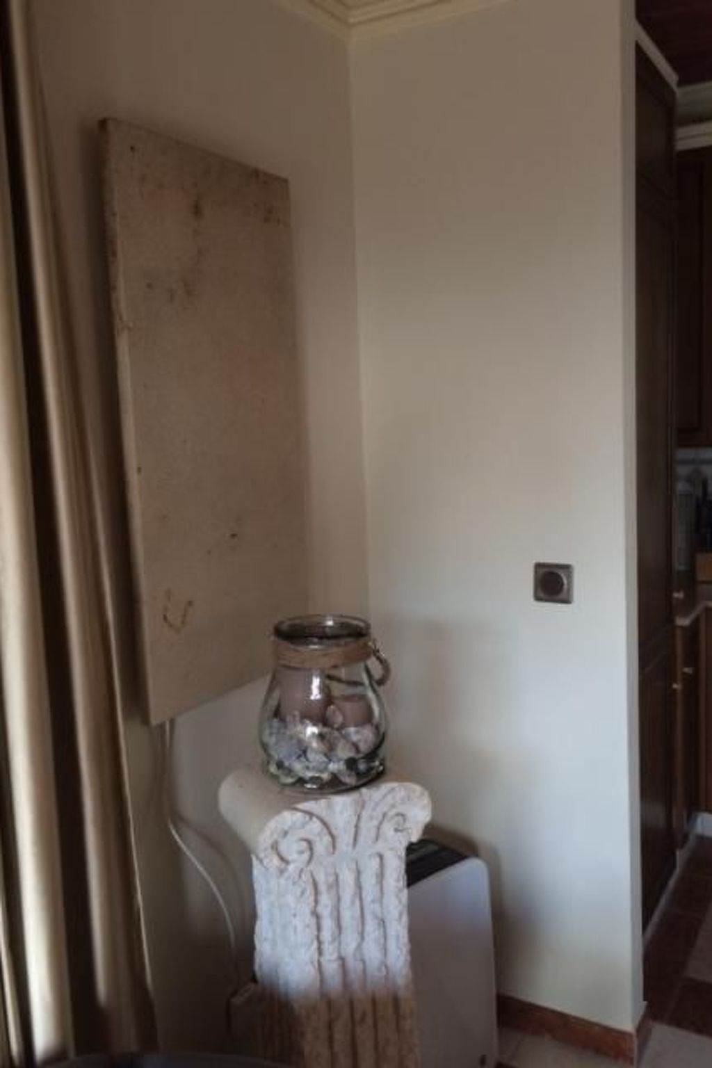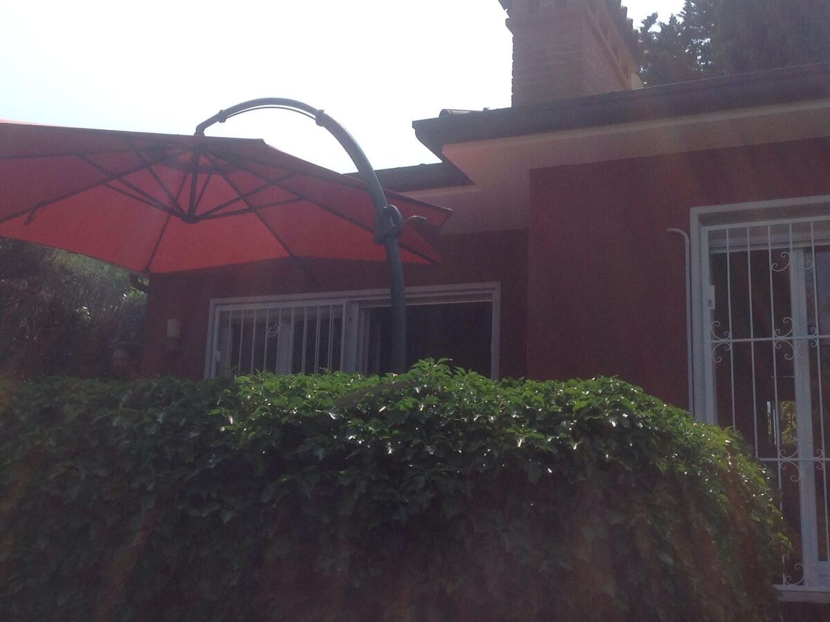 The terrace has a brick-built, open grill fireplace, lovely seating with cushions, a big table and a parasol shading the whole table.