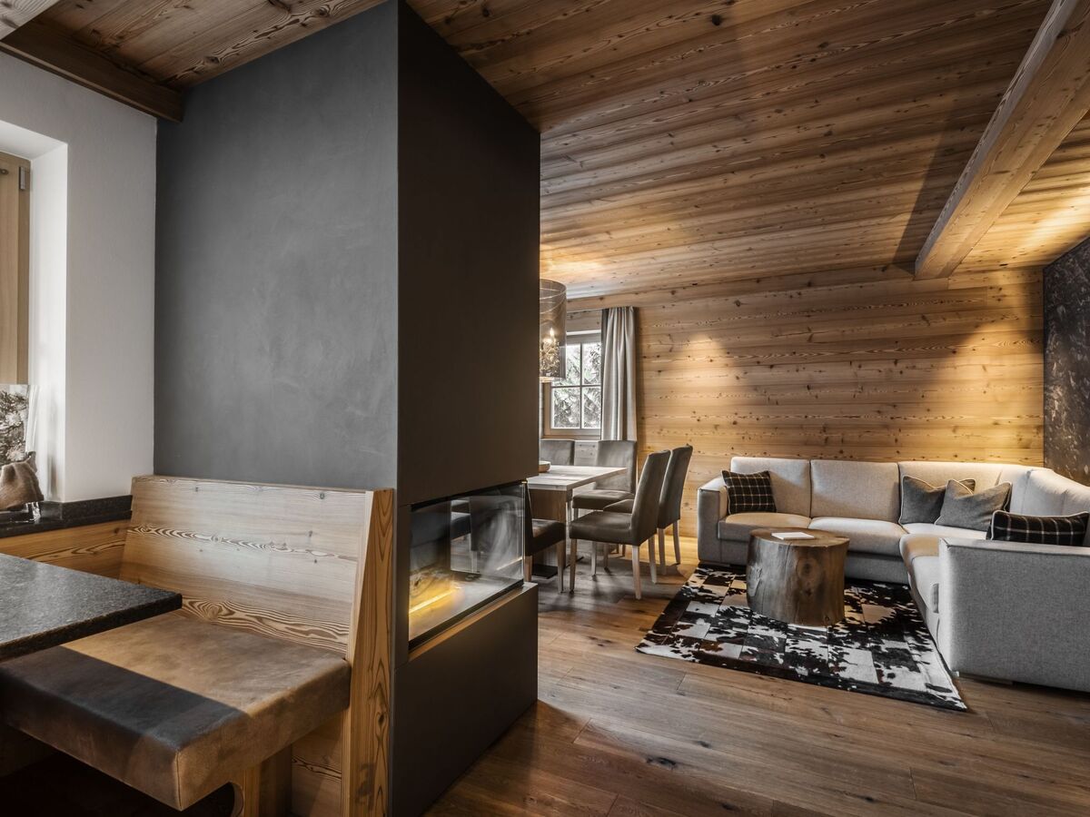 Cosy rooms furnished in Alpine style, an open-plan living room with fireplace and a fully equipped kitchen ...