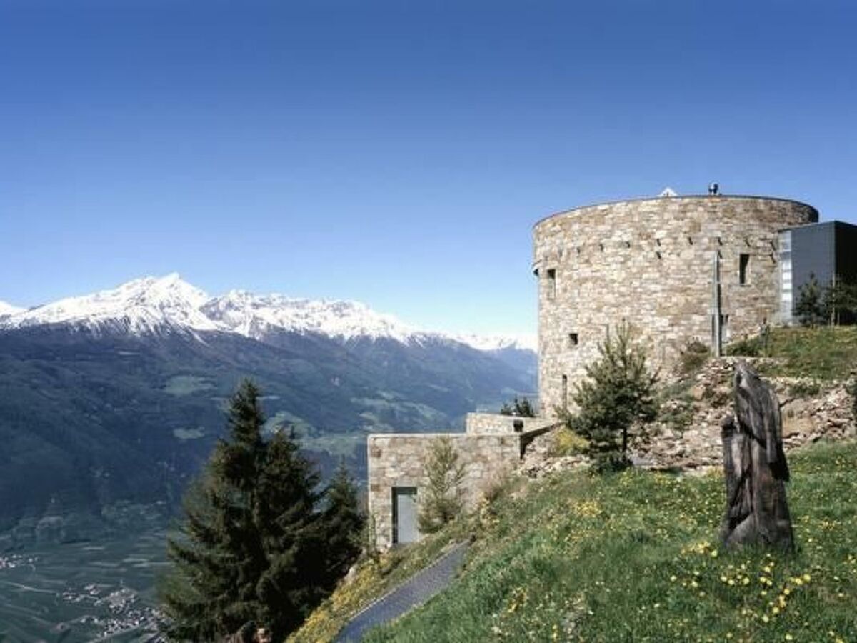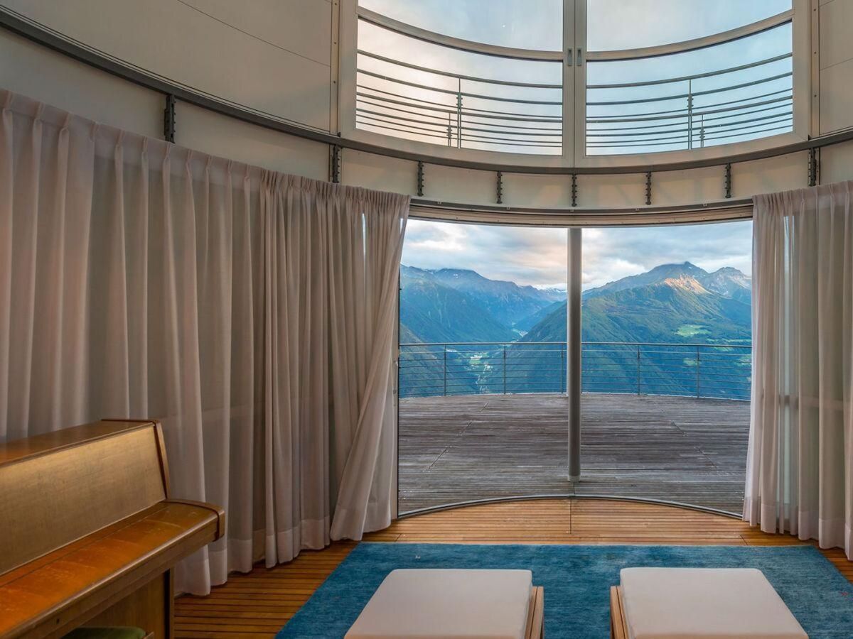 Below this is the spacious home office; through the wide glass front at the front, the views extend into the upper Vinschgau Valley as far as the Swiss mountains, in the smaller window Tarsch appears as a "nature picture", a natural still life in the window frame.