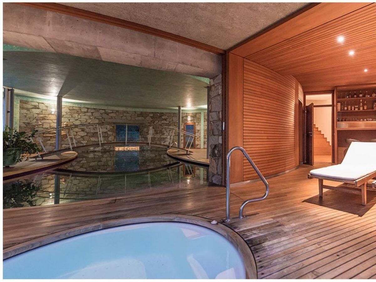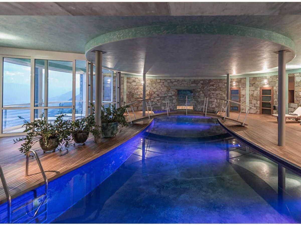The whirlpool with a view of the mountain scenery opposite and the bar can be separated from the swimming area by a "rounded" sliding element (always made of the same chestnut wood); from this area you can access another terrace, secluded and sheltered from the wind, with an open-air shower, enclosed gas barbecue area with chimney flue, dining table and chairs.