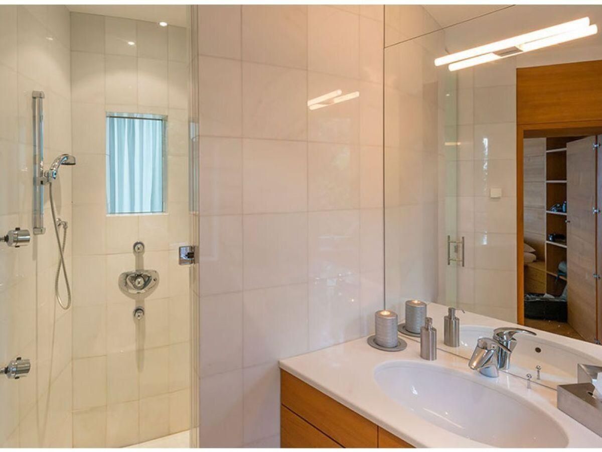 Two guest and children's bedrooms, each with double beds and an additional pull-out bed; in the toilet rooms with bath or shower, the crystalline white marble stone stands out.
