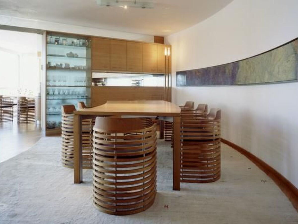 on the huge terrace that closes the tower circle, with a completely linear table and chairs, naturally made of steel and wood.