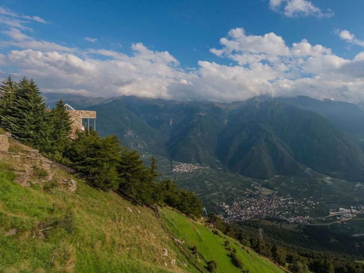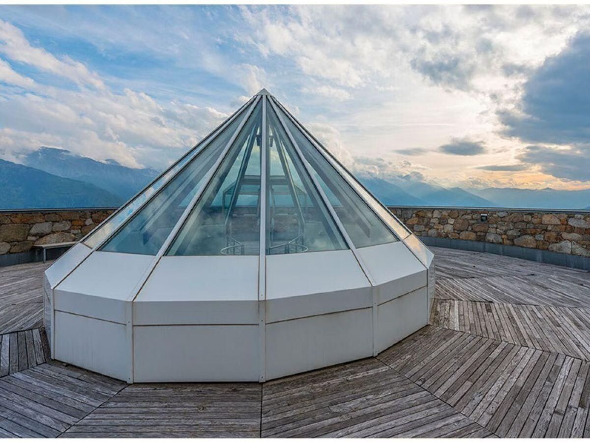 Sauna area with Finnish wooden cabin and view of the Val Martello, Roman steam sauna completely encased in white Lasa marble, as are the walls of the shower.