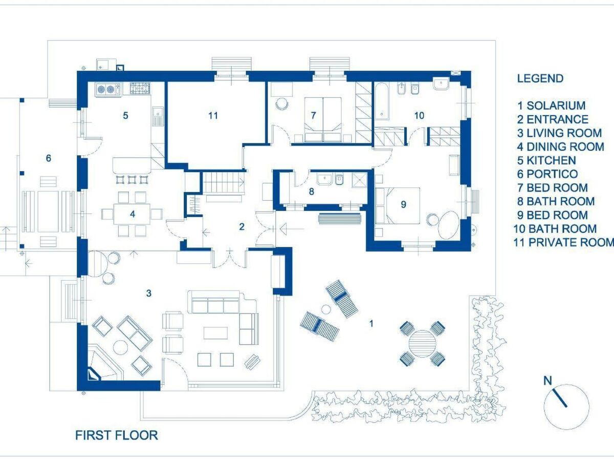 It has an area of 230 square metres and consists of a triple living room with large panoramic windows, equipped with a sofa area with TV, a fireplace corner, a dining table and a large kitchen equipped with a bar counter.