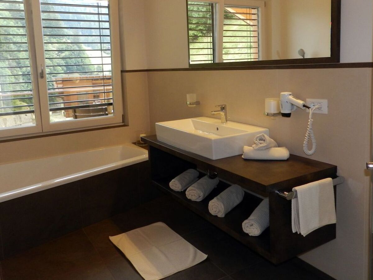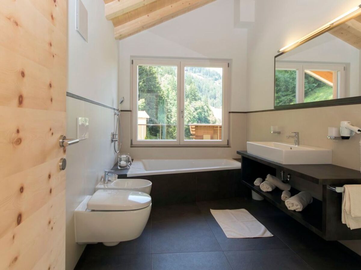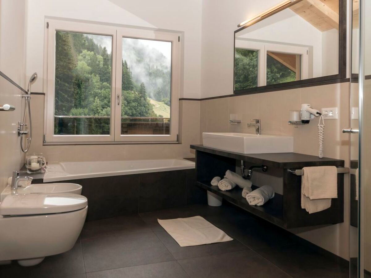 While one bathroom is designed as a full bathroom with shower cubicle, bathtub and bidet, the second bathroom has a shower.