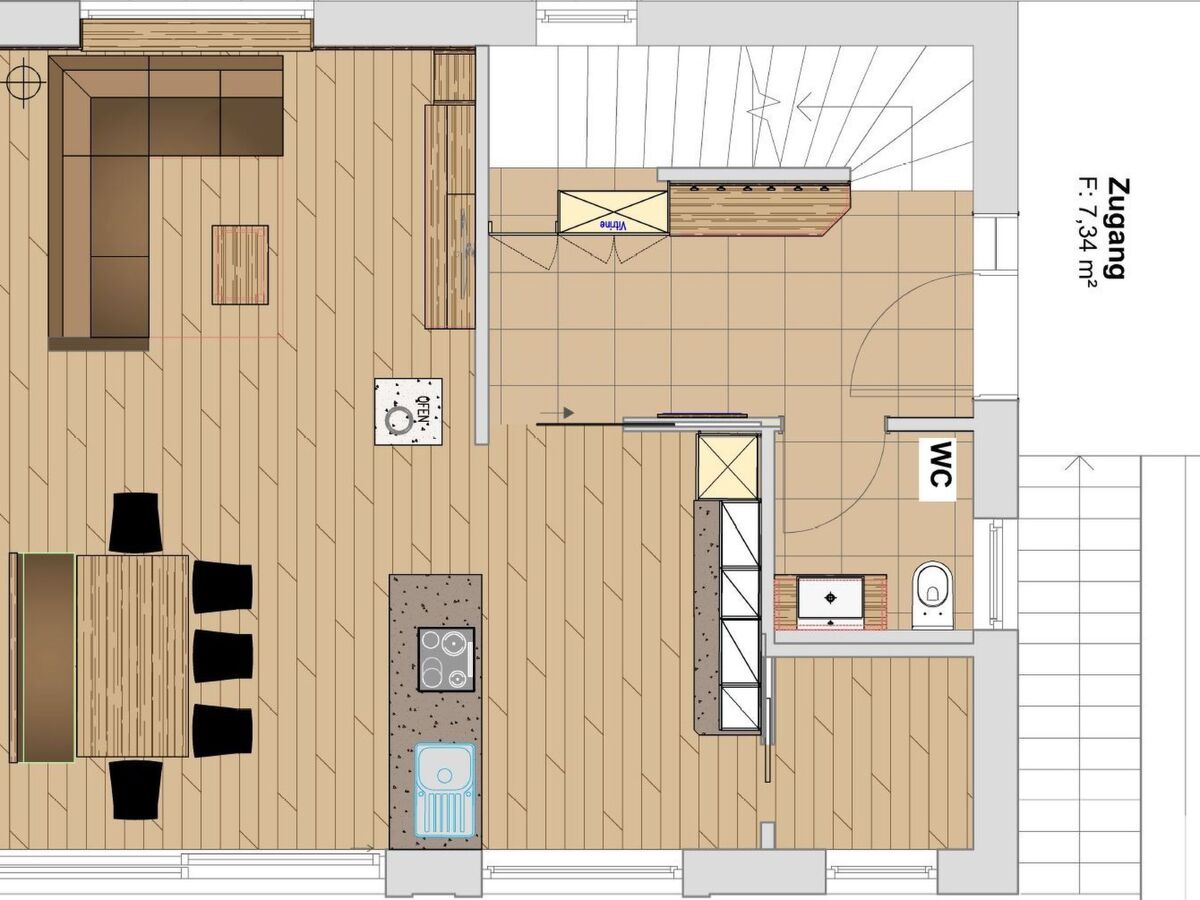 Past the wood-burning stove, which provides cosy warmth in winter, you reach the living area, where you can relax together on a corner sofa after a day out.