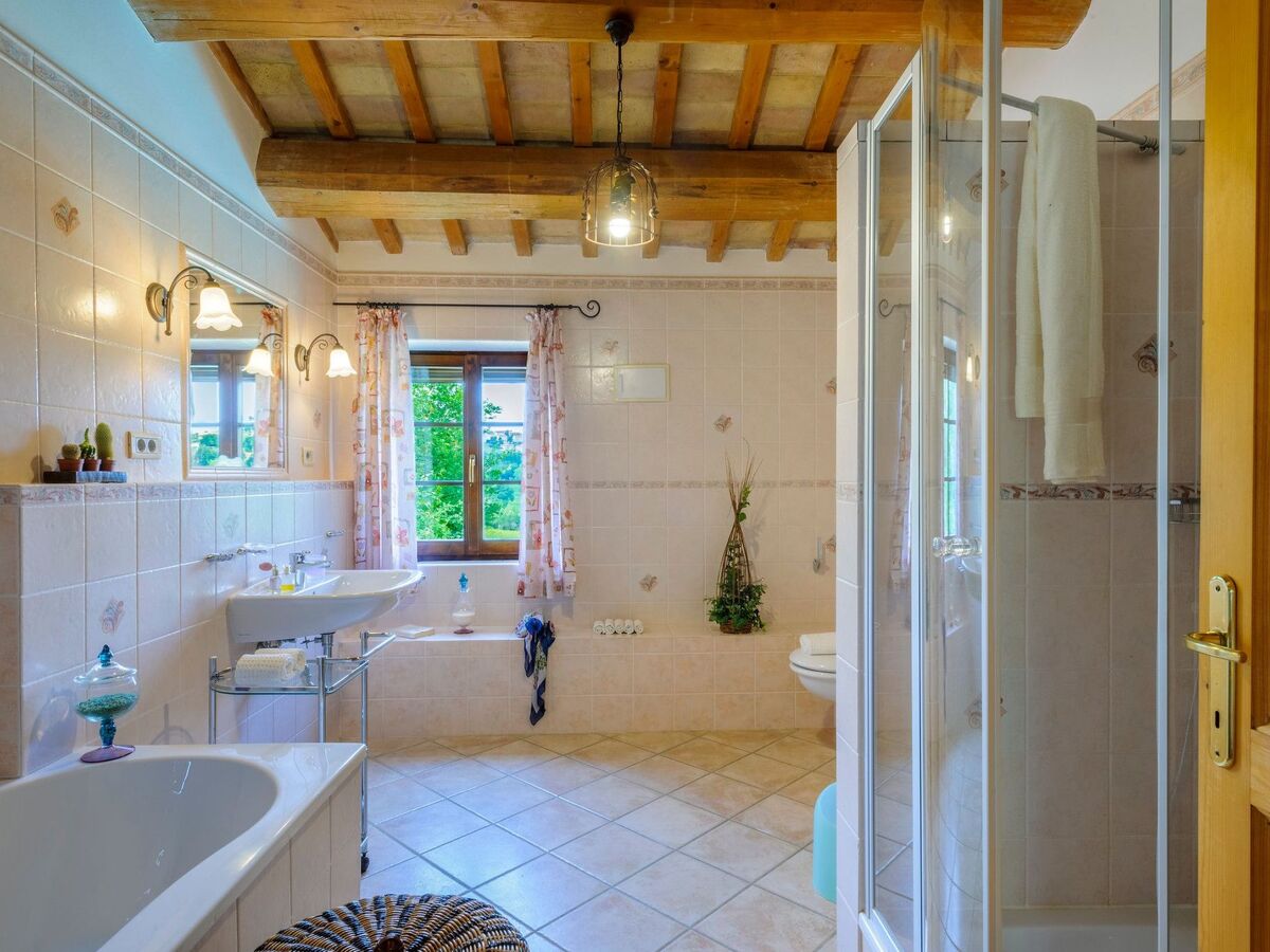 Returning to the corridor and climbing the oak staircase, you enter the sleeping area: on the right there is a double bedroom (with air conditioning) and ensuite bathroom, consisting of toilet, sink, bidet, shower and bathtub.