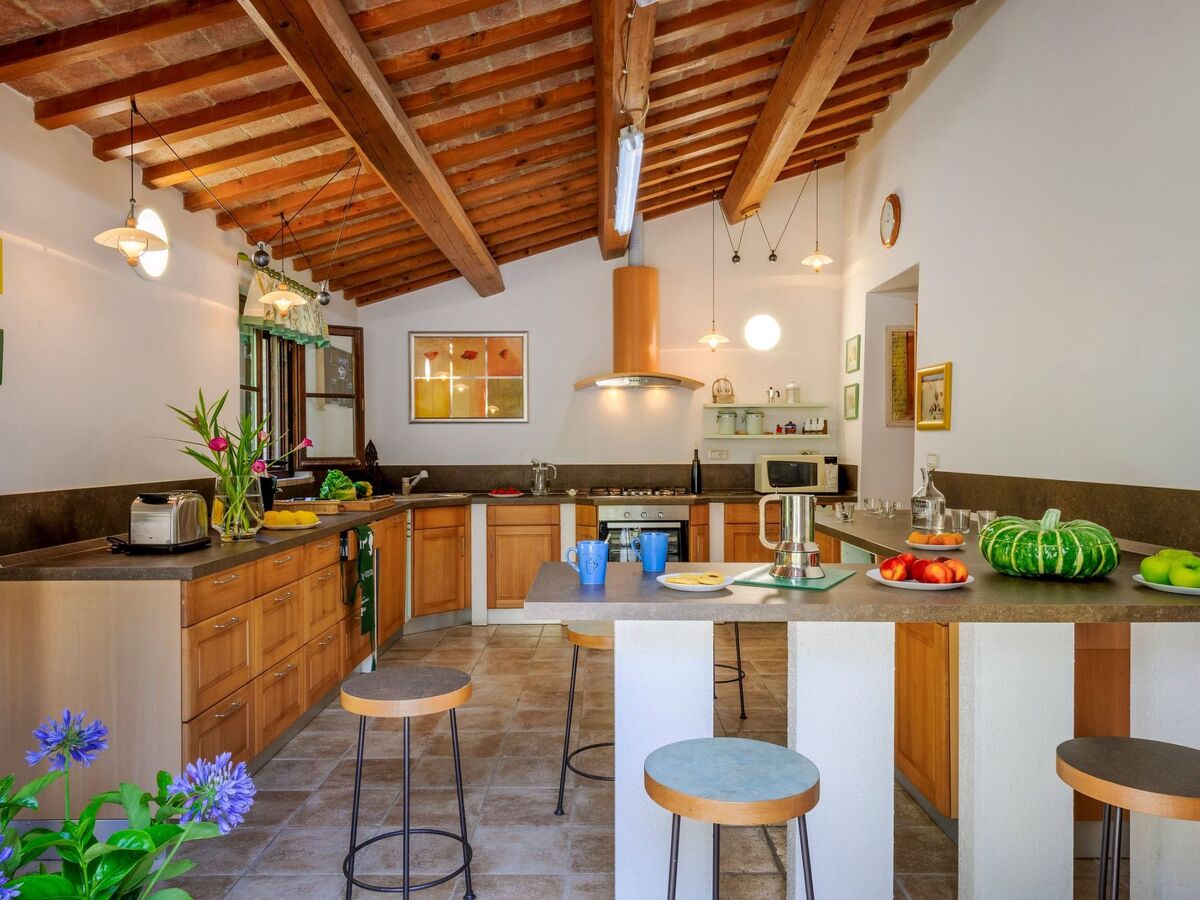 The kitchen with peninsula is well equipped: gas hob with five burners, dishwasher, electric oven, fridge with freezer, utensils and small appliances.