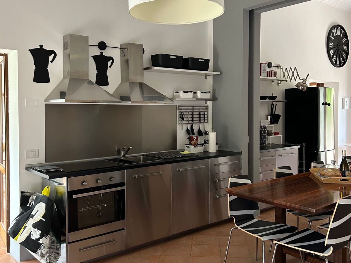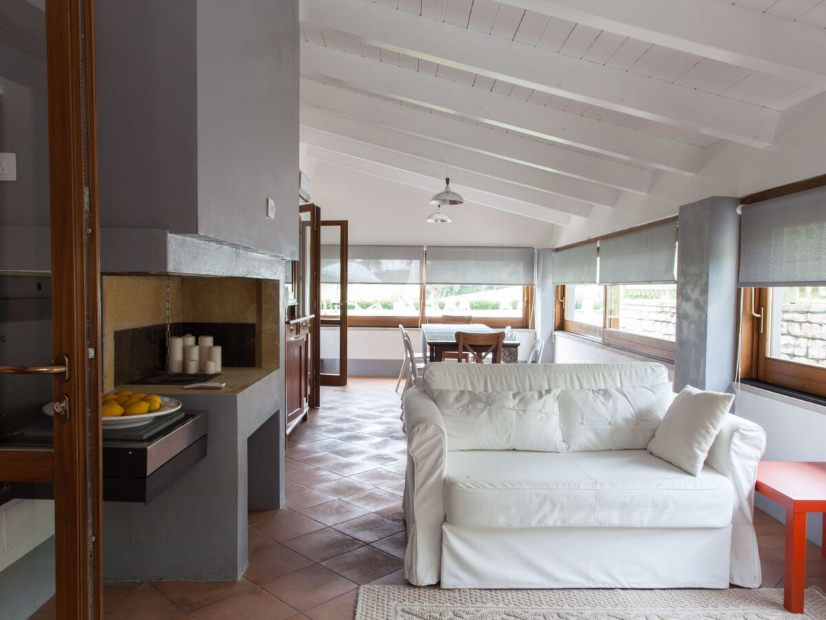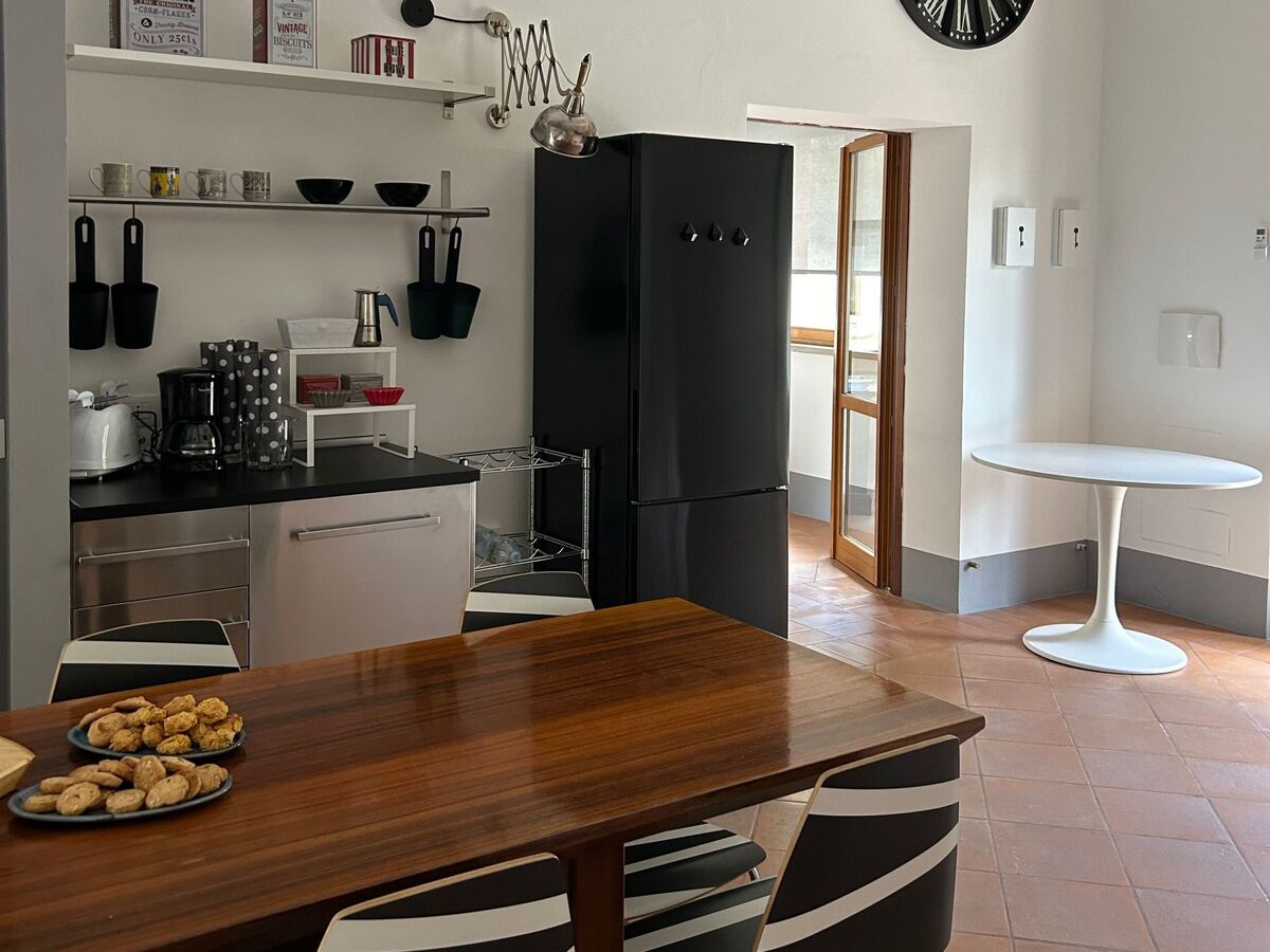 The spacious kitchen is well equipped with a refrigerator, freezer, cooker, electric oven, dishwasher, American and Italian coffee machine, toaster and crockery, while the large wooden table and sofas contribute to a cosy and homely atmosphere.
