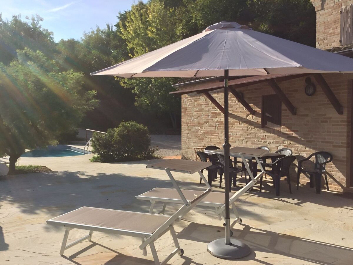 The terrace not only offers a wonderful spot for outdoor dining but also the opportunity to relax on comfortable loungers, perfect for sunbathing or simply enjoying the tranquility of the landscape, near the swimming pool that overlooks the green valley stretching to the sea of Porto San Giorgio.