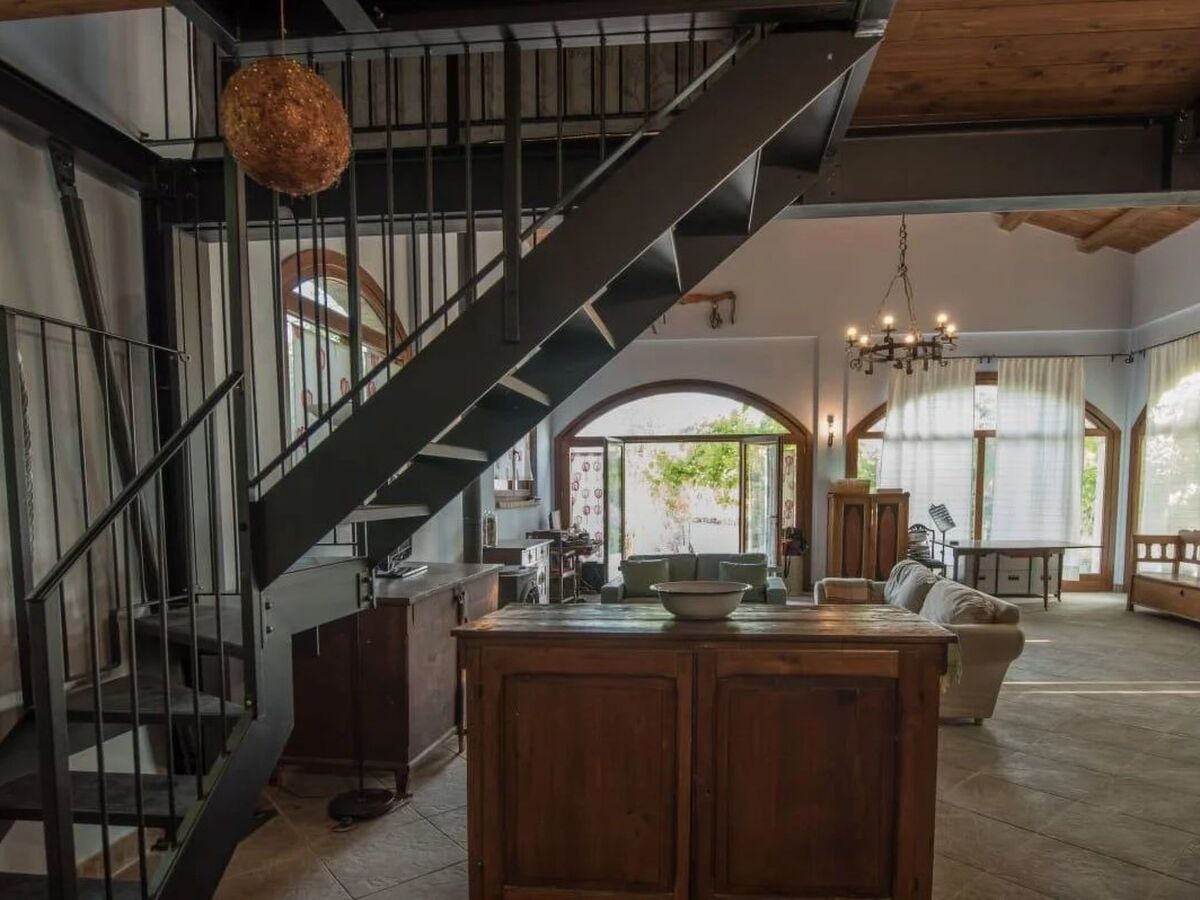 The main house is spread over two floors: on the ground floor, there is a double living room with leather sofas, a dining room with a large table seating up to 16 adults, and a fully equipped kitchen.
