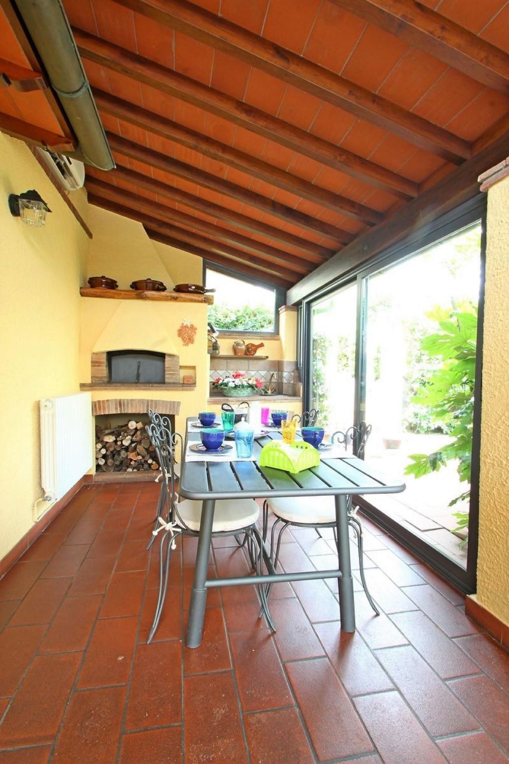 It is complemented by a glazed veranda with access to the garden, air conditioning and a cosy wood-burning stove.