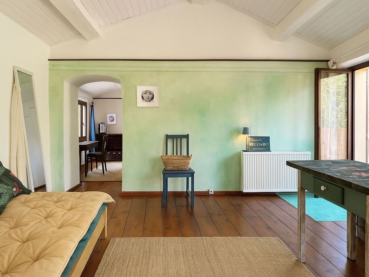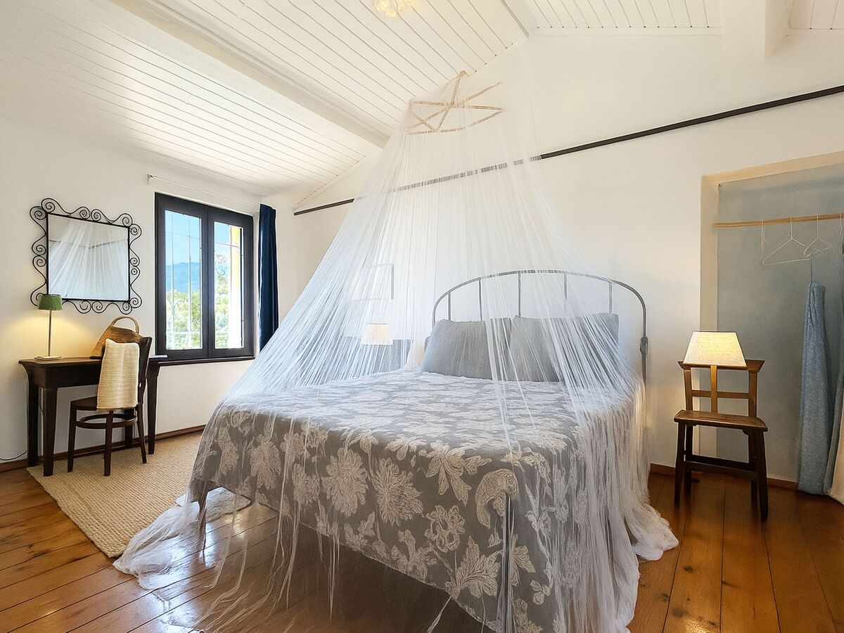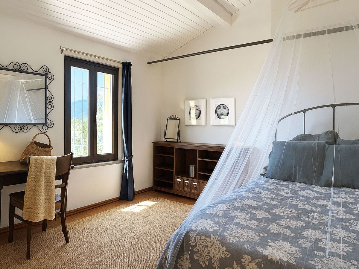 The first floor has a second, larger bedroom with a French bed (1.40 m wide) and 1 walk-through study with table and sofa bed for one person and access to the upper south-east terrace.