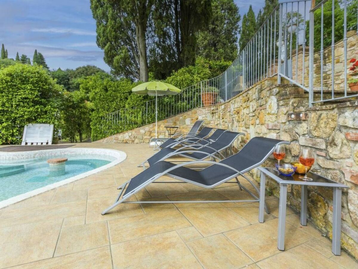 The swimming pool with sun loungers and parasols is perfect for relaxing and cooling off under the Tuscan sun.