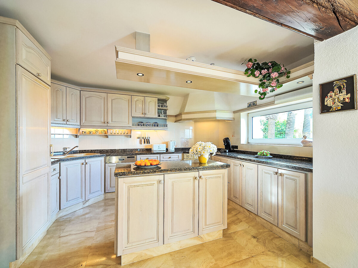 Grande cuisine ouverte (four, lave-vaisselle, 4 plaques vitrocéramiques, micro-ondes, congélateur, cafetière électrique).