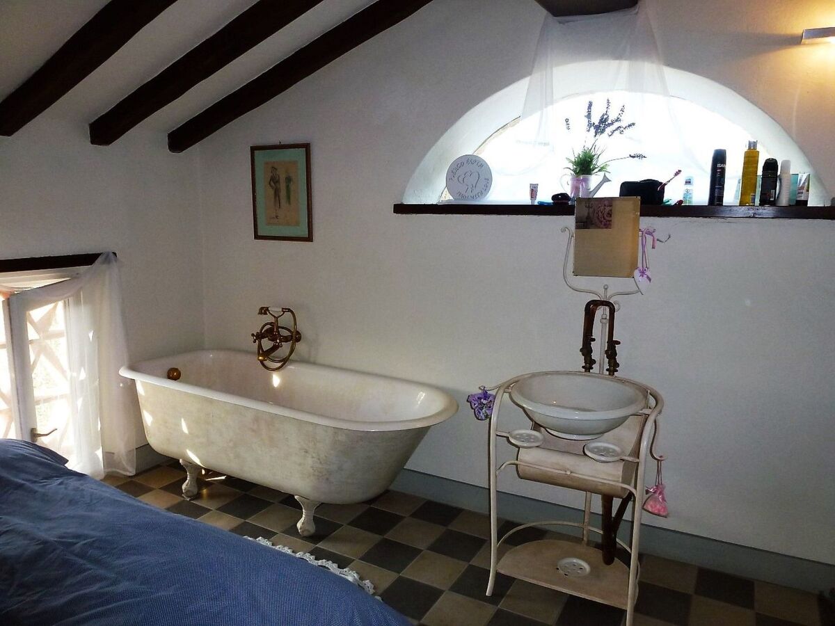 On the first floor there is a double bedroom with a bathtub and washbasin.