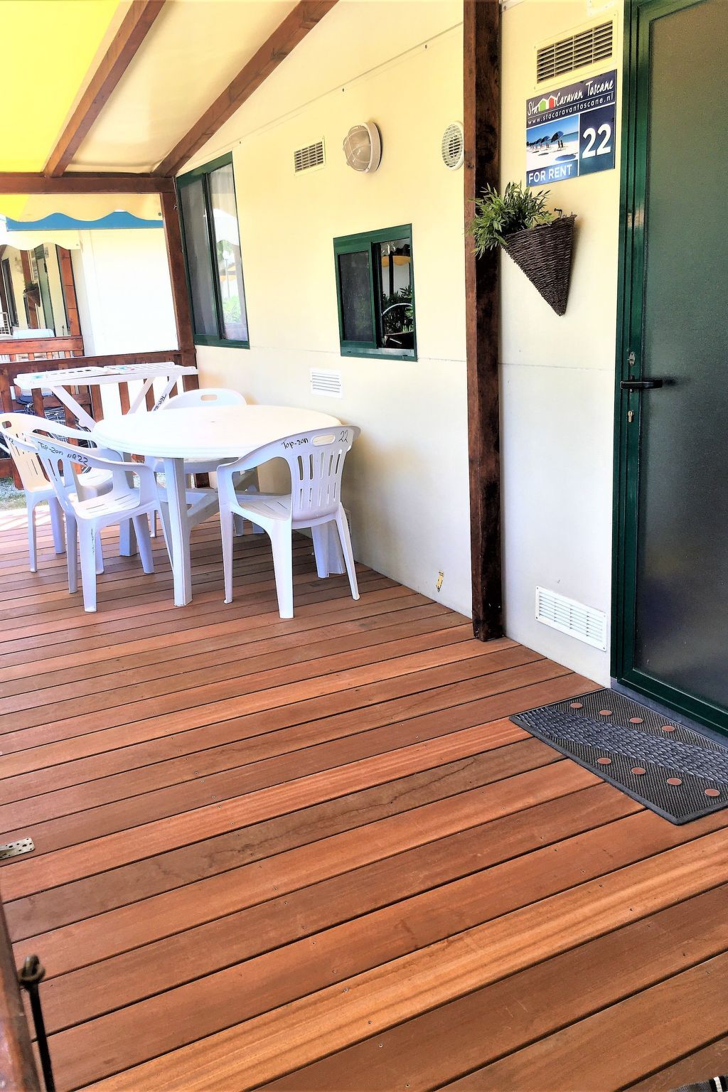 Outside there is a large, roofed and furnished veranda measuring 7 x 2m.Next to the mobile home there is a free private parking space.From the campsite there is a shuttle bus to the seaside, only in the main season There is also a large children’s playground with six large trampolines, a football pitch, climbing frames and a shared swimming pool.There are also a restaurant, a supermarket, a shop with camping gear and bike and mountain bike rental.The campsite has a capacity of around 400 places and there is a reception where Italian, German, Dutch and English are spoken.