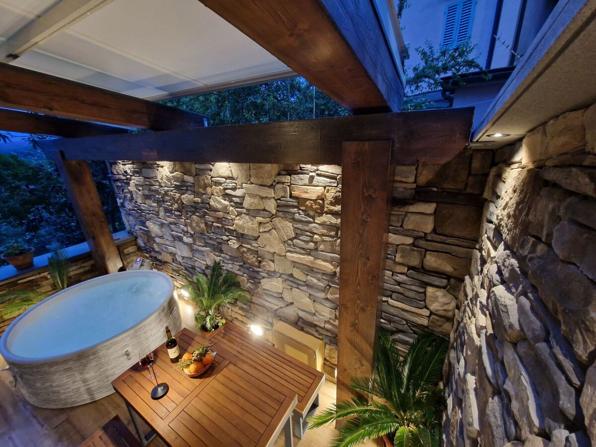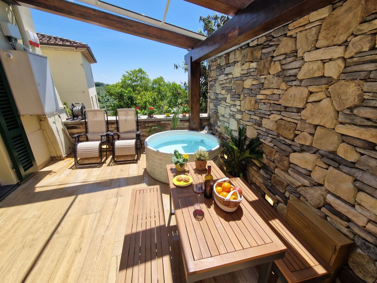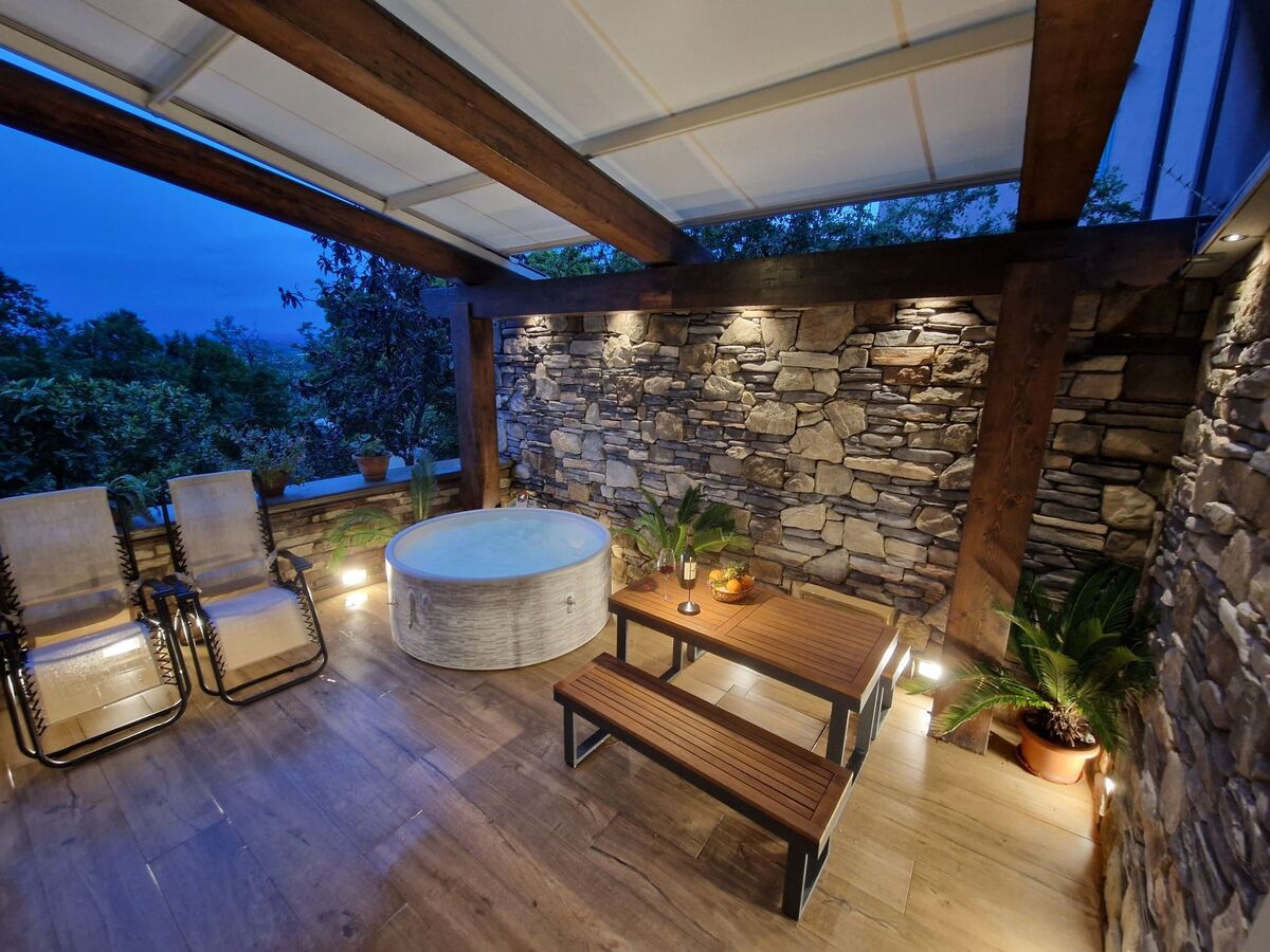 Le site'esterno, una suggestiva terrazza con vista panoramica aumenta il valore di questa dimora, dotata di vasca idromassaggio e lettini prendisole ideali per momenti di puro relax ammirando lo splendido scenario naturale che circonda la casa.